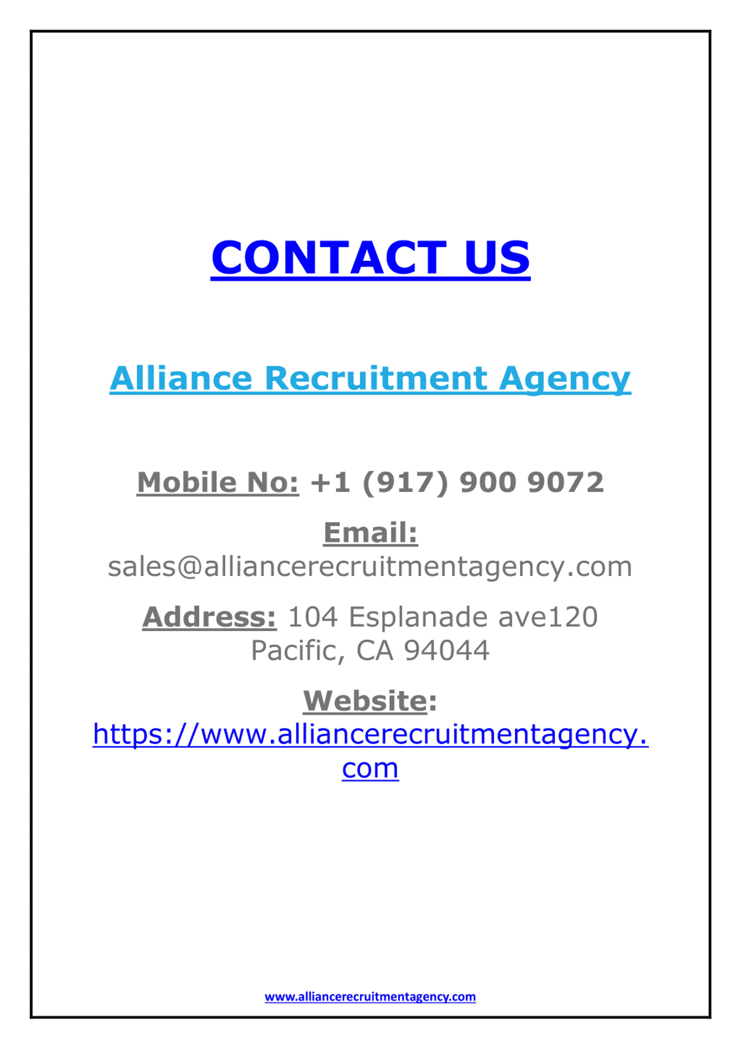 CONTACT US Alliance Recruitment Agency Mobile No: +1 (917) 900 9072 Email: sales@alliancerecruitmentagency.com Address: 104 Esplanade ave120 Pacific, CA 94044 Website: https://www.alliancerecruitmentagency. com www.alliancerecruitmentagency.com