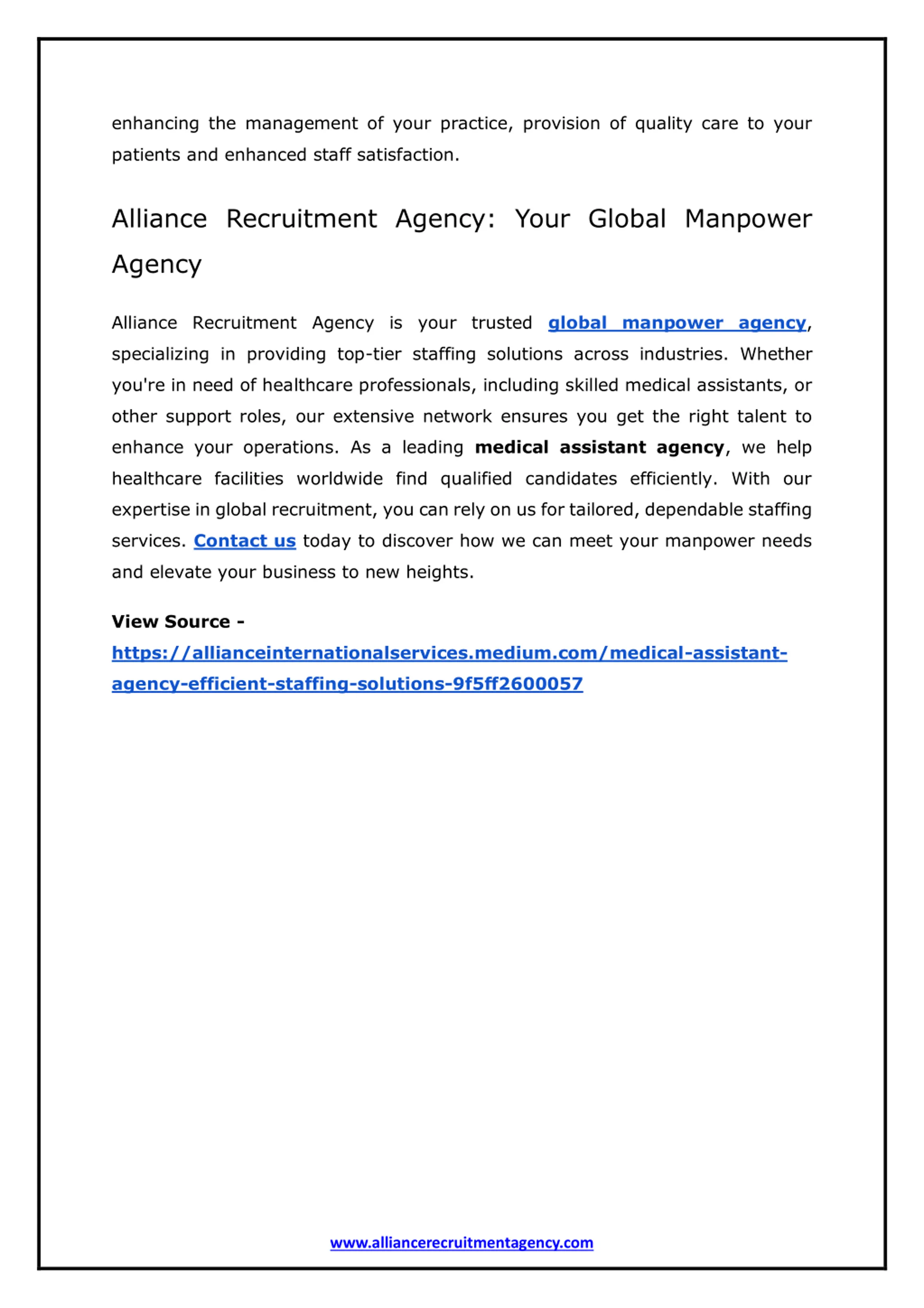 enhancing the management of your practice, provision of quality care to your patients and enhanced staff satisfaction. Alliance Recruitment Agency: Your Global Manpower Agency Alliance Recruitment Agency is your trusted global manpower agency, specializing in providing top-tier staffing solutions across industries. Whether you're in need of healthcare professionals, including skilled medical assistants, or other support roles, our extensive network ensures you get the right talent to enhance your operations. As a leading medical assistant agency, we help healthcare facilities worldwide find qualified candidates efficiently. With our expertise in global recruitment, you can rely on us for tailored, dependable staffing services. Contact us today to discover how we can meet your manpower needs and elevate your business to new heights. View Source - https://allianceinternationalservices.medium.com/medical-assistant- agency-efficient-staffing-solutions-9f5ff2600057 www.alliancerecruitmentagency.com