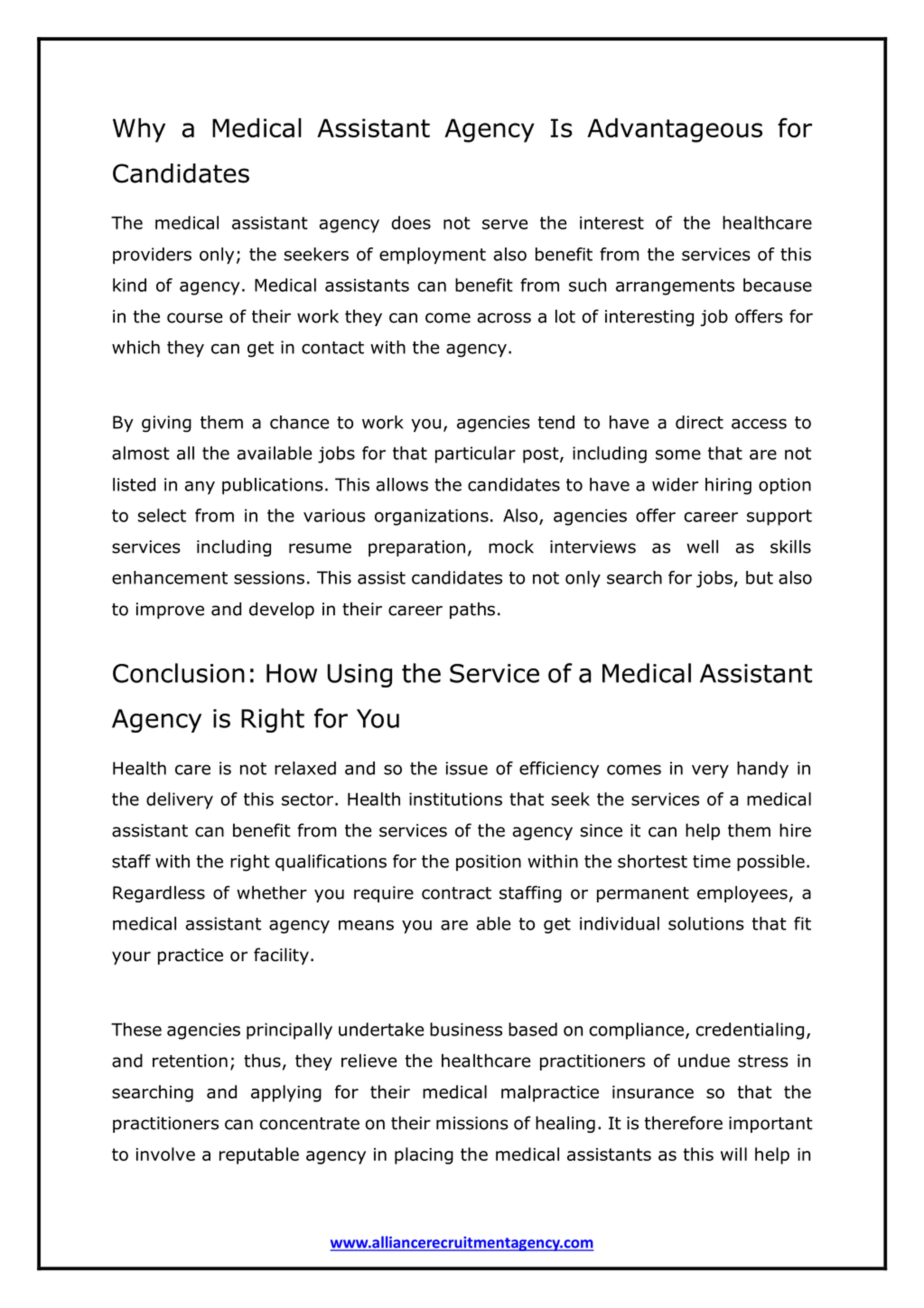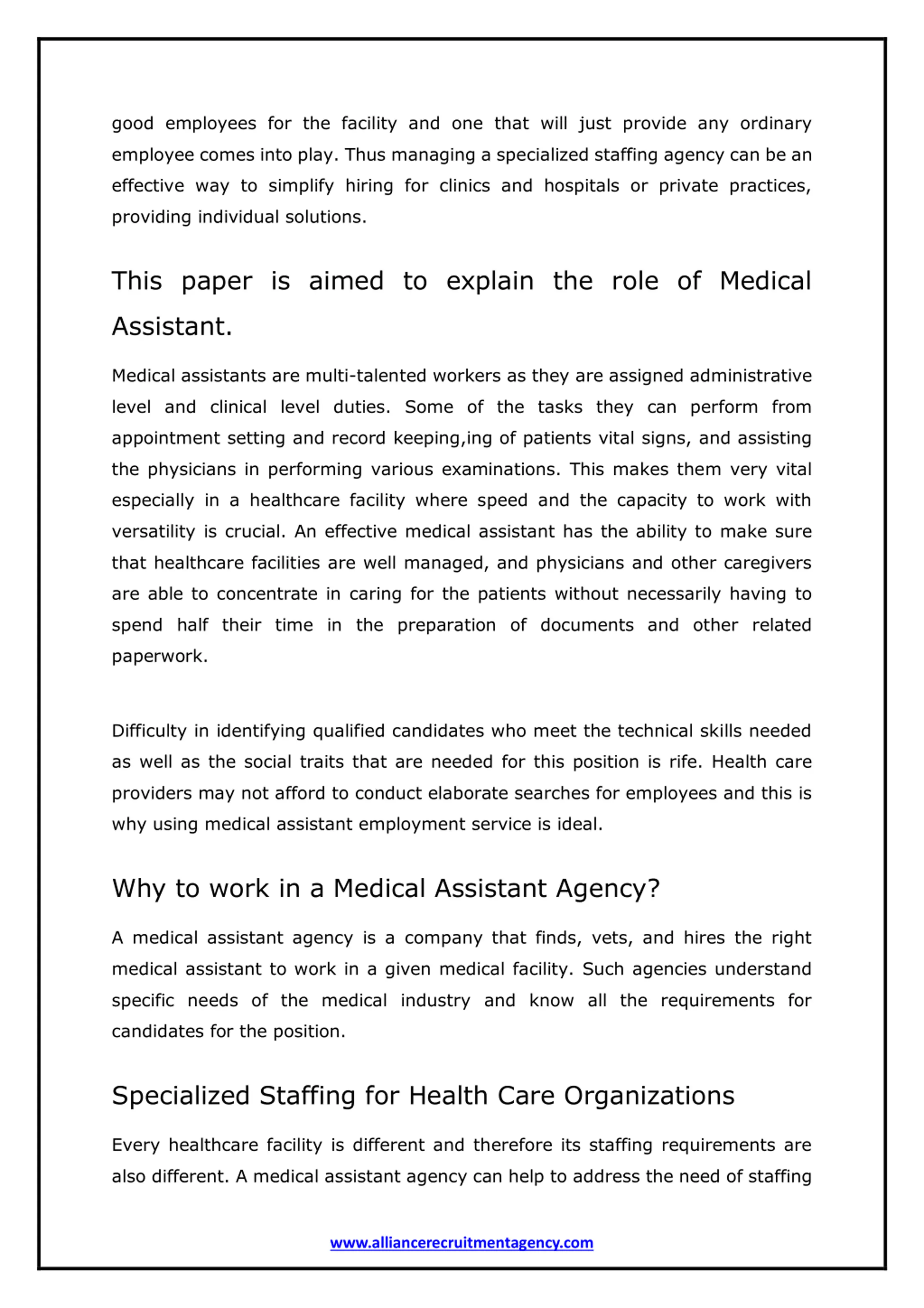 good employees for the facility and one that will just provide any ordinary employee comes into play. Thus managing a specialized staffing agency can be an effective way to simplify hiring for clinics and hospitals or private practices, providing individual solutions. This paper is aimed to explain the role of Medical Assistant. Medical assistants are multi-talented workers as they are assigned administrative level and clinical level duties. Some of the tasks they can perform from appointment setting and record keeping,ing of patients vital signs, and assisting the physicians in performing various examinations. This makes them very vital especially in a healthcare facility where speed and the capacity to work with versatility is crucial. An effective medical assistant has the ability to make sure that healthcare facilities are well managed, and physicians and other caregivers are able to concentrate in caring for the patients without necessarily having to spend half their time in the preparation of documents and other related paperwork. Difficulty in identifying qualified candidates who meet the technical skills needed as well as the social traits that are needed for this position is rife. Health care providers may not afford to conduct elaborate searches for employees and this is why using medical assistant employment service is ideal. Why to work in a Medical Assistant Agency? A medical assistant agency is a company that finds, vets, and hires the right medical assistant to work in a given medical facility. Such agencies understand specific needs of the medical industry and know all the requirements for candidates for the position. Specialized Staffing for Health Care Organizations Every healthcare facility is different and therefore its staffing requirements are also different. A medical assistant agency can help to address the need of staffing www.alliancerecruitmentagency.com