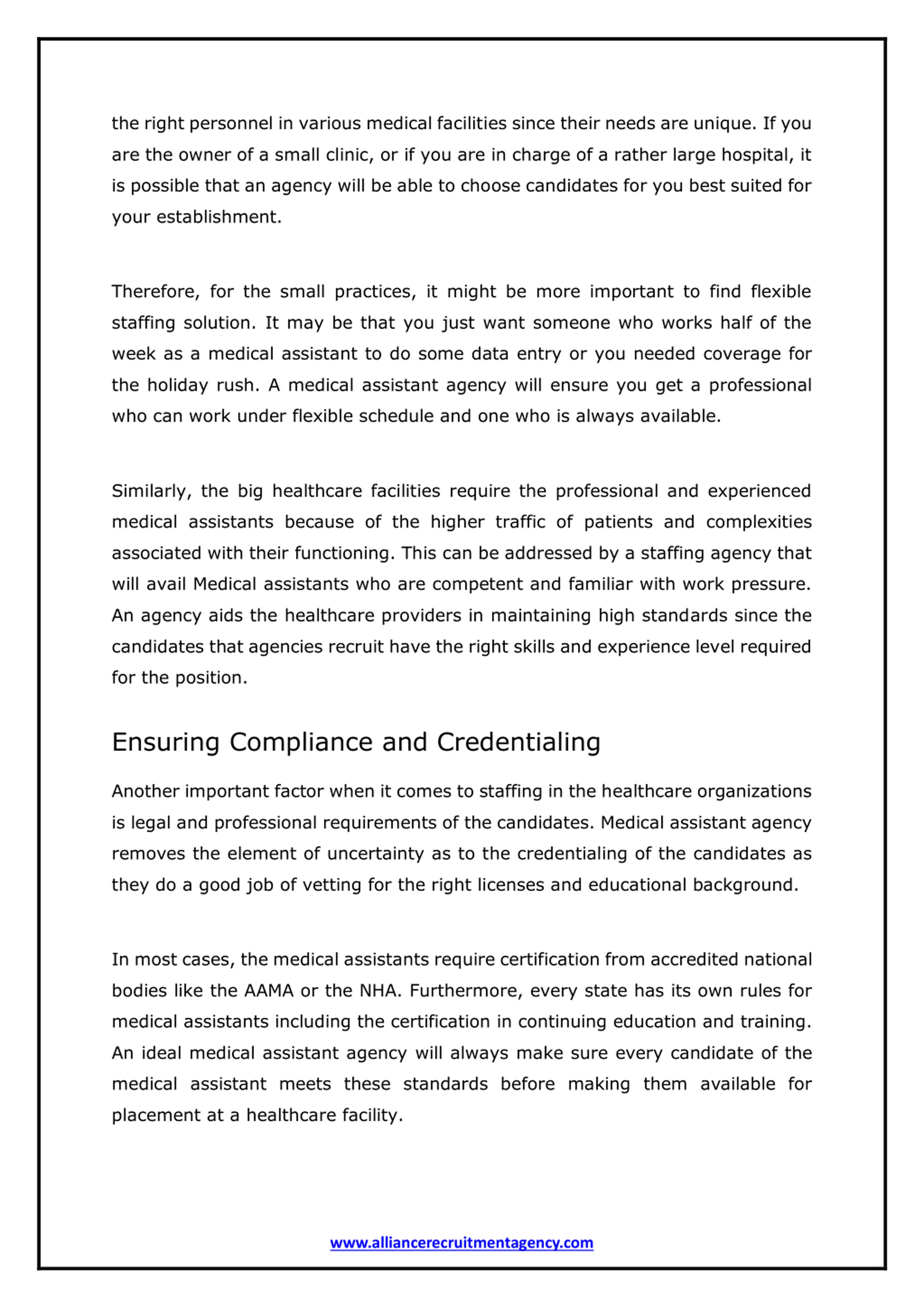 the right personnel in various medical facilities since their needs are unique. If you are the owner of a small clinic, or if you are in charge of a rather large hospital, it is possible that an agency will be able to choose candidates for you best suited for your establishment. Therefore, for the small practices, it might be more important to find flexible staffing solution. It may be that you just want someone who works half of the week as a medical assistant to do some data entry or you needed coverage for the holiday rush. A medical assistant agency will ensure you get a professional who can work under flexible schedule and one who is always available. Similarly, the big healthcare facilities require the professional and experienced medical assistants because of the higher traffic of patients and complexities associated with their functioning. This can be addressed by a staffing agency that will avail Medical assistants who are competent and familiar with work pressure. An agency aids the healthcare providers in maintaining high standards since the candidates that agencies recruit have the right skills and experience level required for the position. Ensuring Compliance and Credentialing Another important factor when it comes to staffing in the healthcare organizations is legal and professional requirements of the candidates. Medical assistant agency removes the element of uncertainty as to the credentialing of the candidates as they do a good job of vetting for the right licenses and educational background. In most cases, the medical assistants require certification from accredited national bodies like the AAMA or the NHA. Furthermore, every state has its own rules for medical assistants including the certification in continuing education and training. An ideal medical assistant agency will always make sure every candidate of the medical assistant meets these standards before making them available for placement at a healthcare facility. www.alliancerecruitmentagency.com