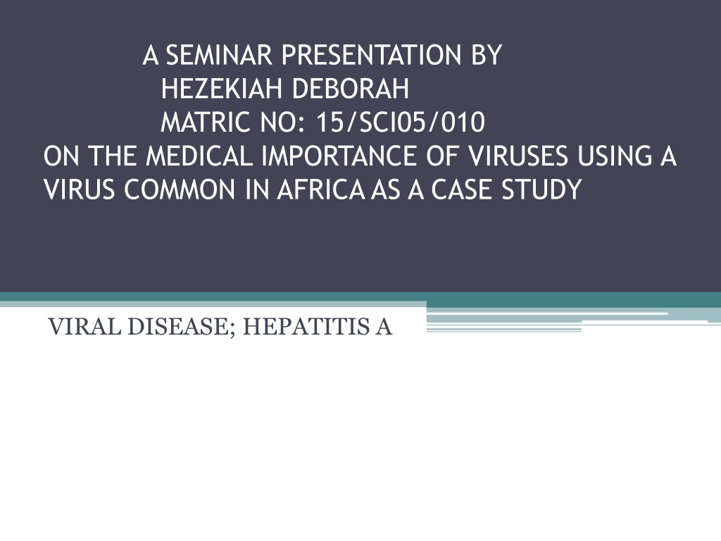 A SEMINAR PRESENTATION BY HEZEKIAH DEBORAH MATRIC NO: 15/SCI05/010 ON THE MEDICAL IMPORTANCE OF VIRUSES USING A VIRUS COMMON IN AFRICA AS A CASE STUDY VIRAL DISEASE; HEPATITIS A