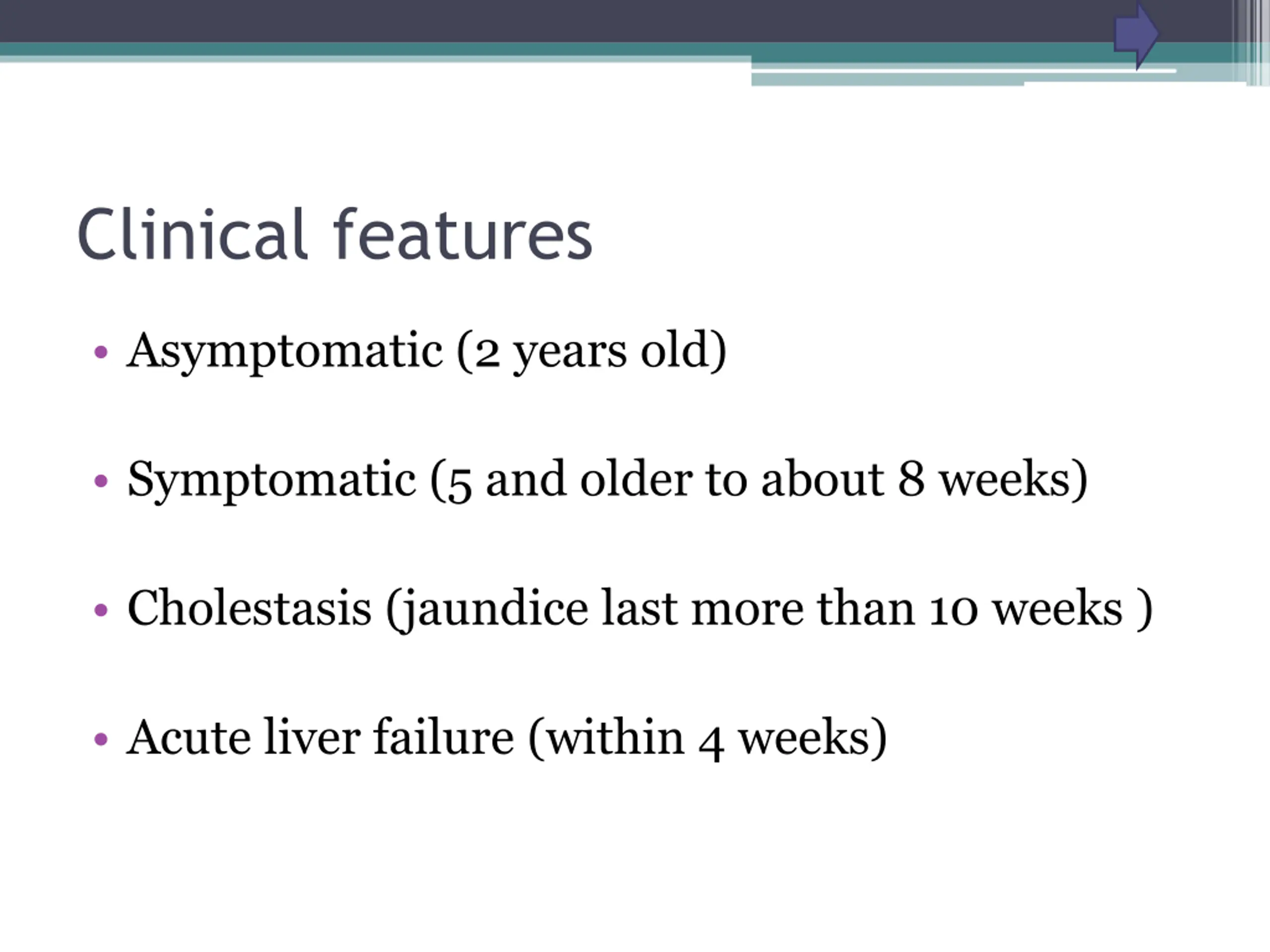 Clinical features Asymptomatic (2 years old) Symptomatic (5 and older to about 8 weeks) Cholestasis (jaundice last more than 10 weeks ) Acute liver failure (within 4 weeks)