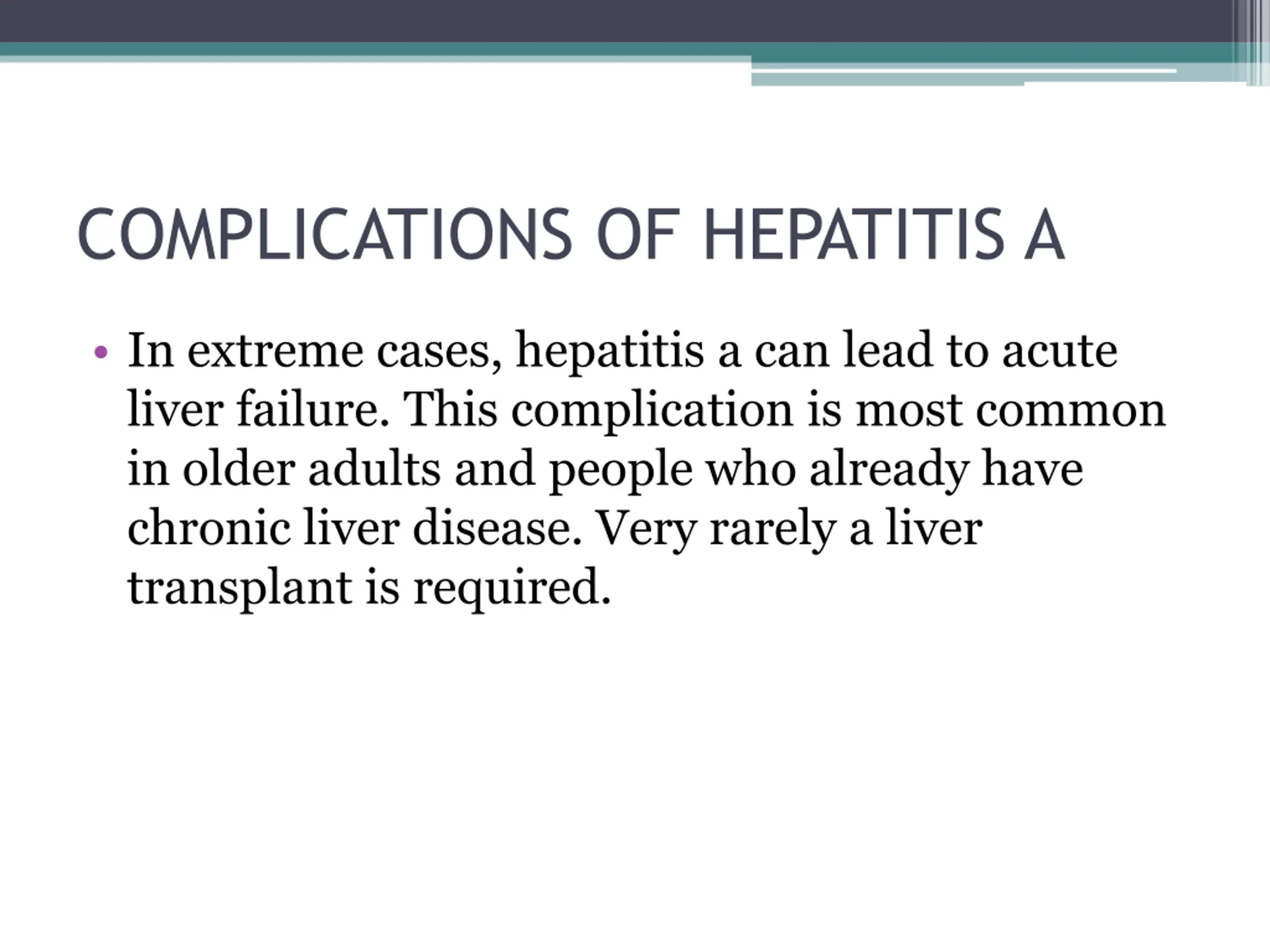 COMPLICATIONS OF HEPATITIS A In extreme cases, hepatitis a can lead to acute liver failure. This complication is most common in older adults and people who already have chronic liver disease. Very rarely a liver transplant is required.