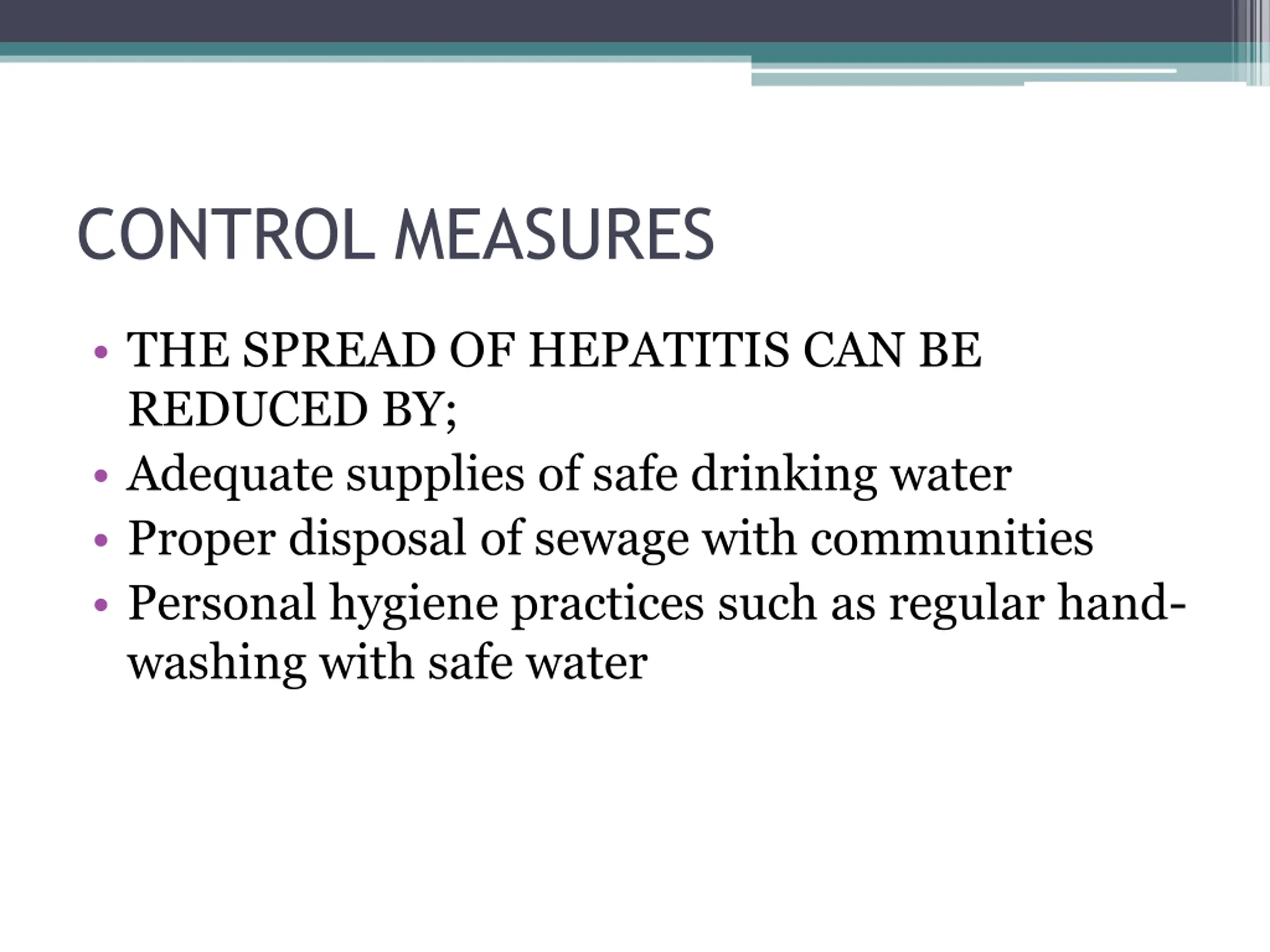 CONTROL MEASURES THE SPREAD OF HEPATITIS CAN BE REDUCED BY; Adequate supplies of safe drinking water Proper disposal of sewage with communities Personal hygiene practices such as regular hand- washing with safe water