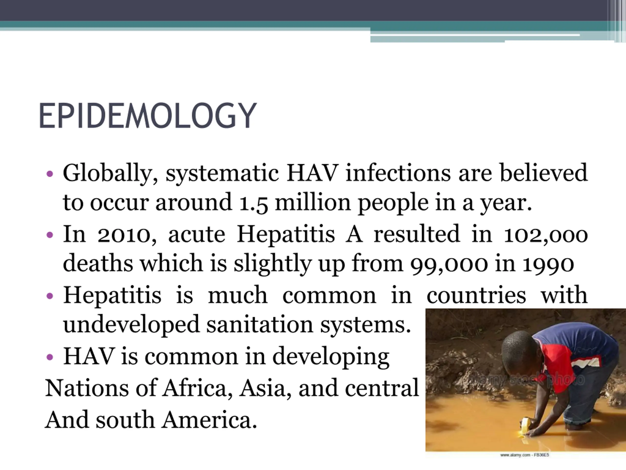 EPIDEMOLOGY Globally, systematic HAV infections are believed to occur around 1.5 million people in a year. In 2010, acute Hepatitis A resulted in 102,ooo deaths which is slightly up from 99,000 in 1990 Hepatitis is much common in countries with undeveloped sanitation systems. HAV is common in developing Nations of Africa, Asia, and central And south America.