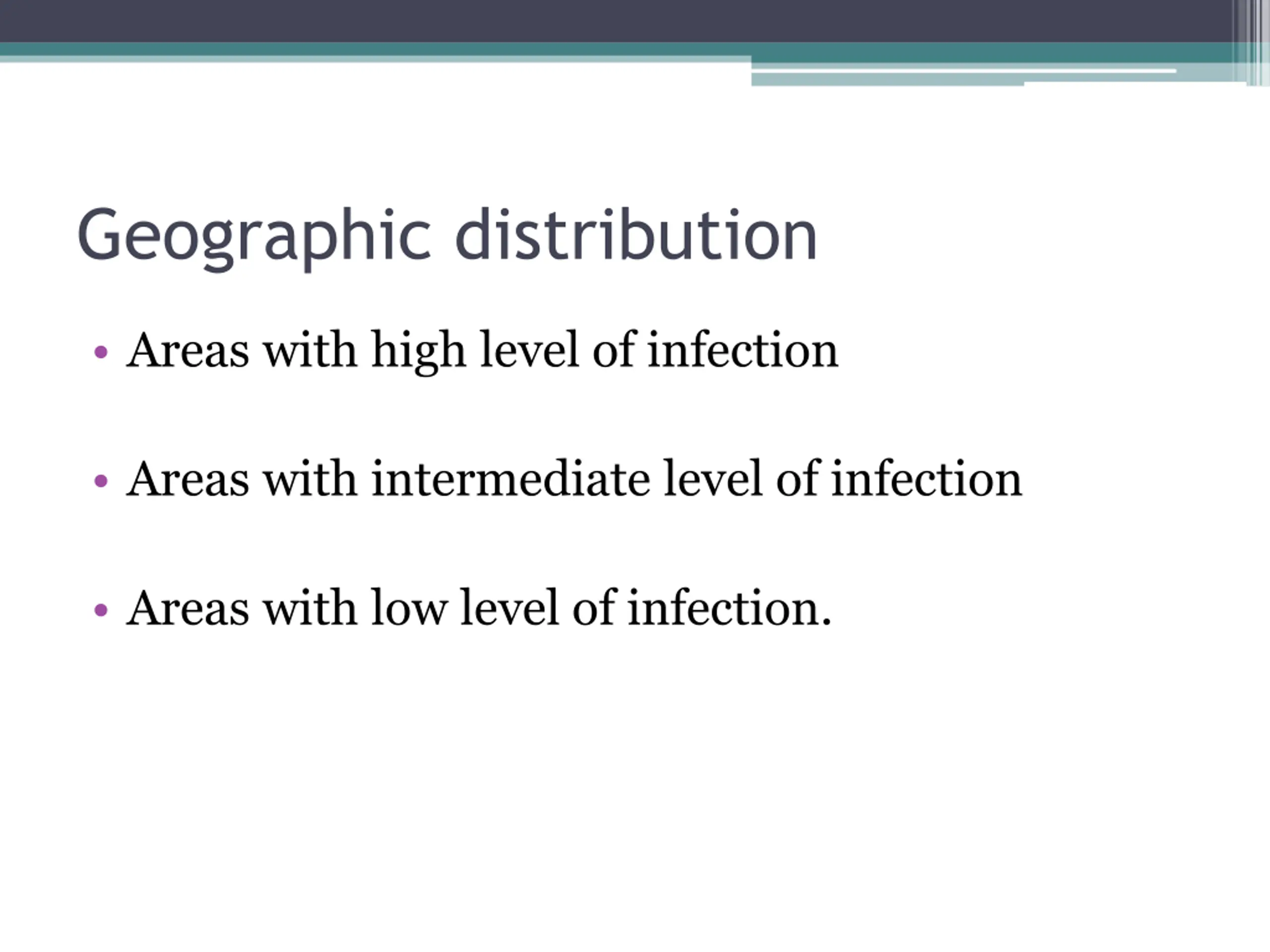 Geographic distribution Areas with high level of infection Areas with intermediate level of infection Areas with low level of infection.