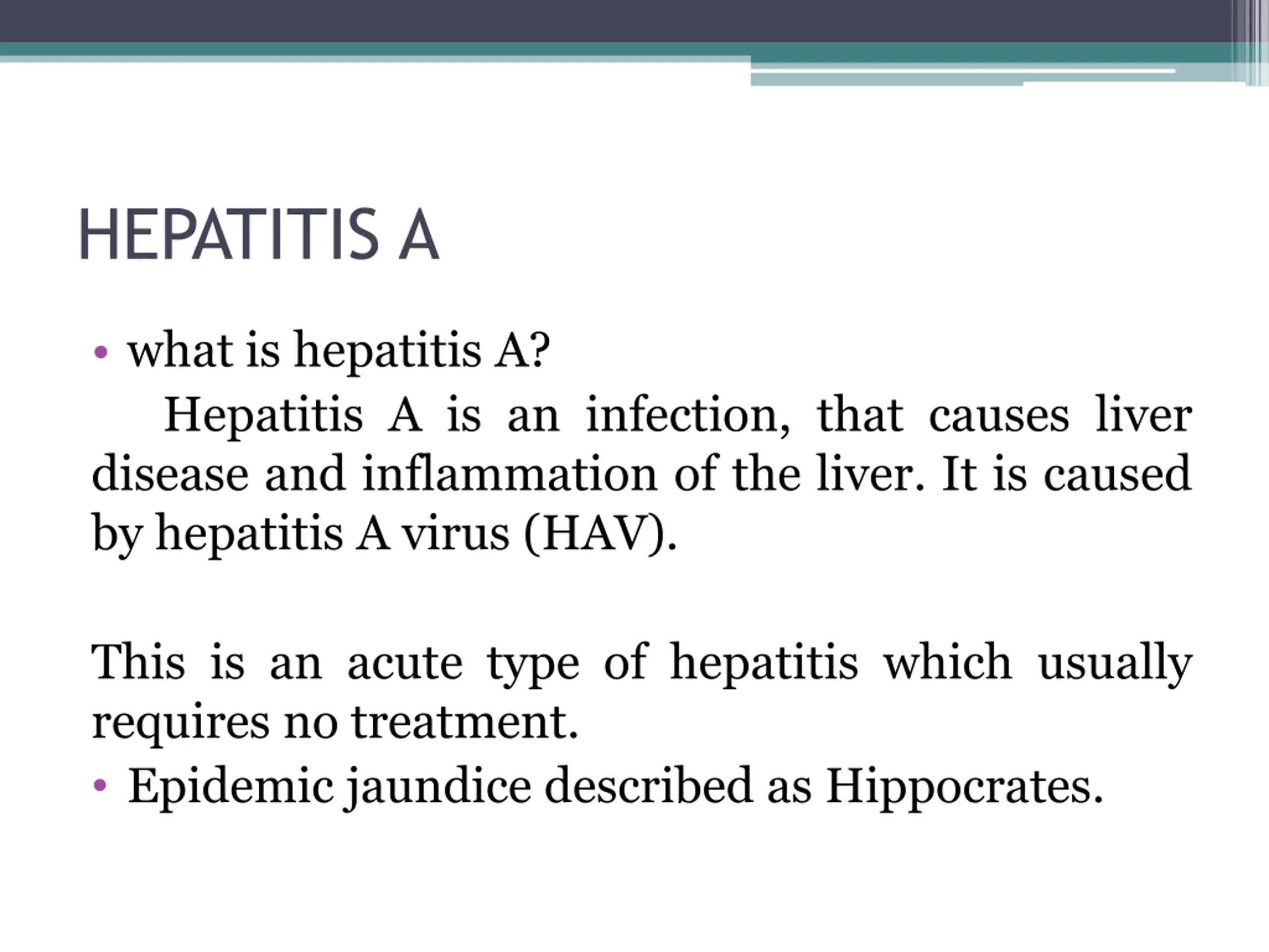 HEPATITIS A what is hepatitis A? Hepatitis A is an infection, that causes liver disease and inflammation of the liver. It is caused by hepatitis A virus (HAV). This is an acute type of hepatitis which usually requires no treatment. Epidemic jaundice described as Hippocrates.