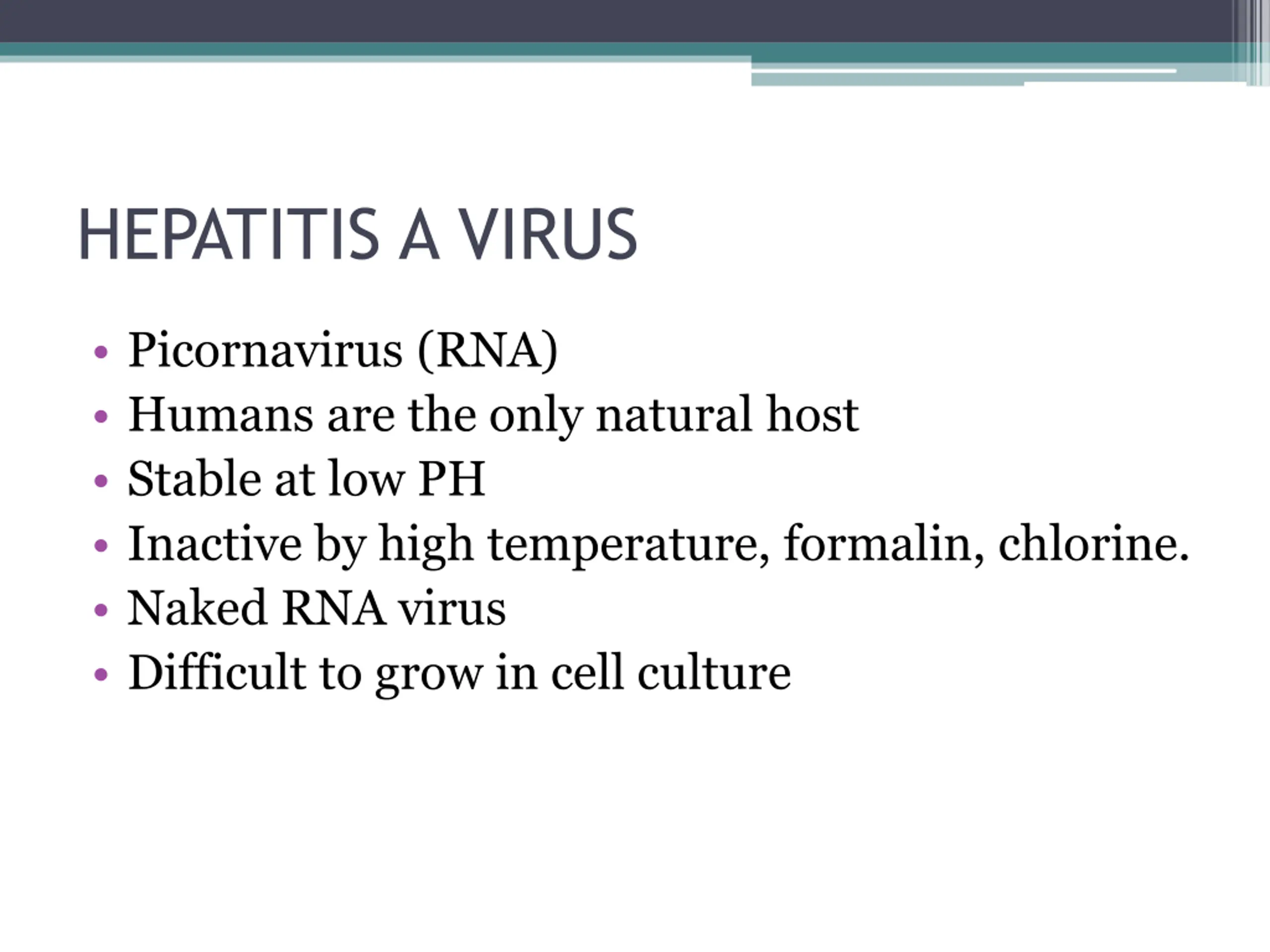 HEPATITIS A VIRUS Picornavirus (RNA) Humans are the only natural host Stable at low PH Inactive by high temperature, formalin, chlorine. Naked RNA virus Difficult to grow in cell culture