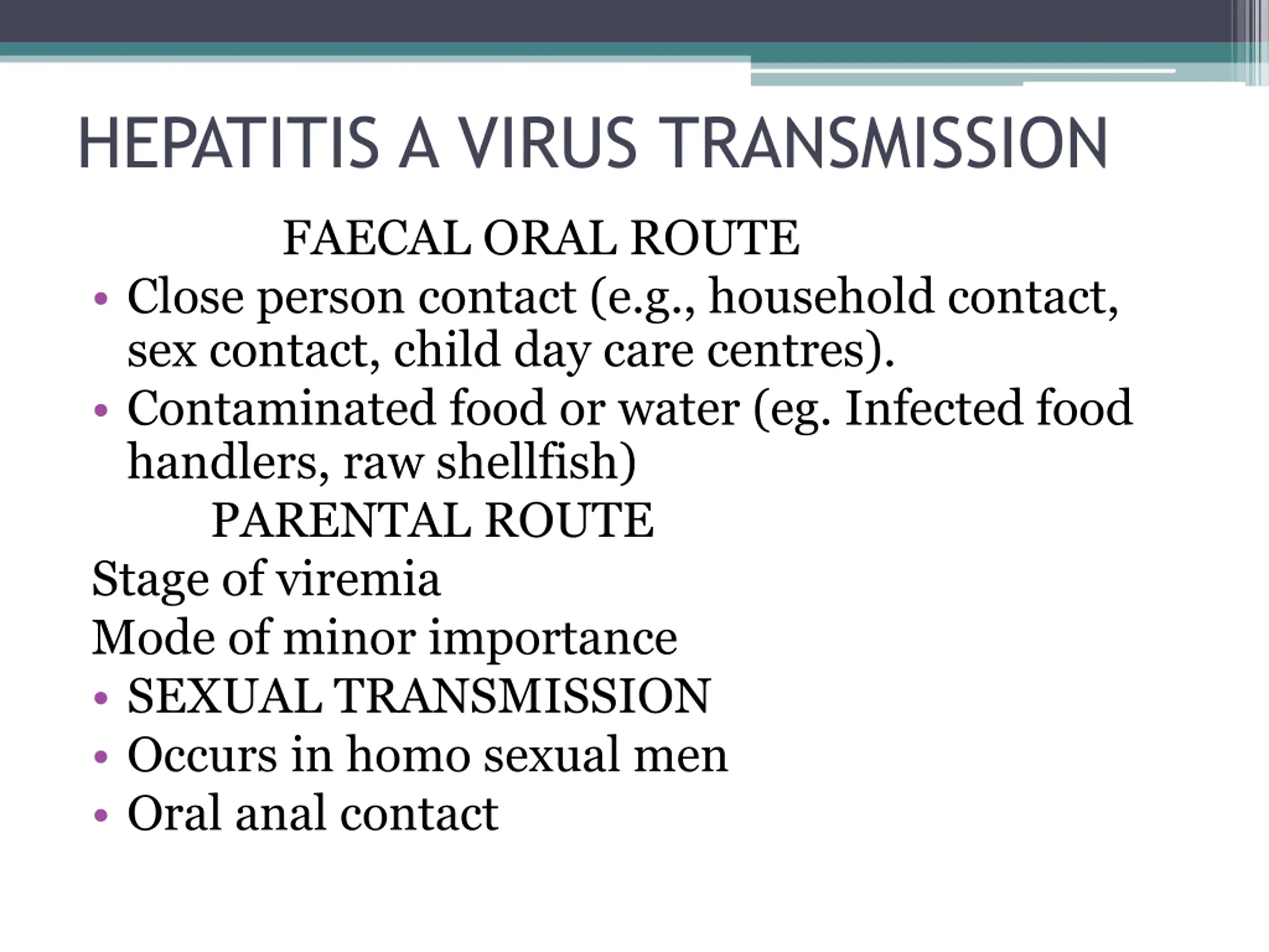 HEPATITIS A VIRUS TRANSMISSION FAECAL ORAL ROUTE Close person contact (e.g., household contact, sex contact, child day care centres). Contaminated food or water (eg. Infected food handlers, raw shellfish) PARENTAL ROUTE Stage of viremia Mode of minor importance SEXUAL TRANSMISSION Occurs in homo sexual men Oral anal contact