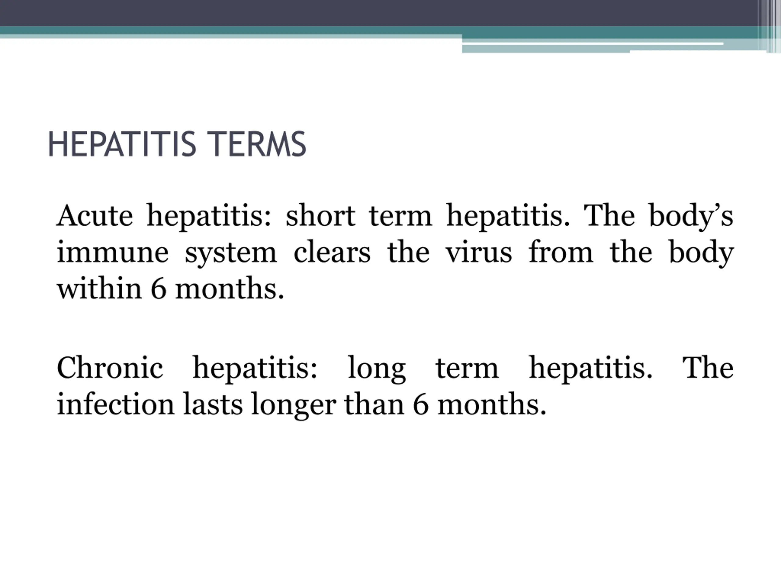 HEPATITIS TERMS Acute hepatitis: short term hepatitis. The body s immune system clears the virus from the body within 6 months. Chronic infection lasts longer than 6 months. hepatitis: long term hepatitis. The