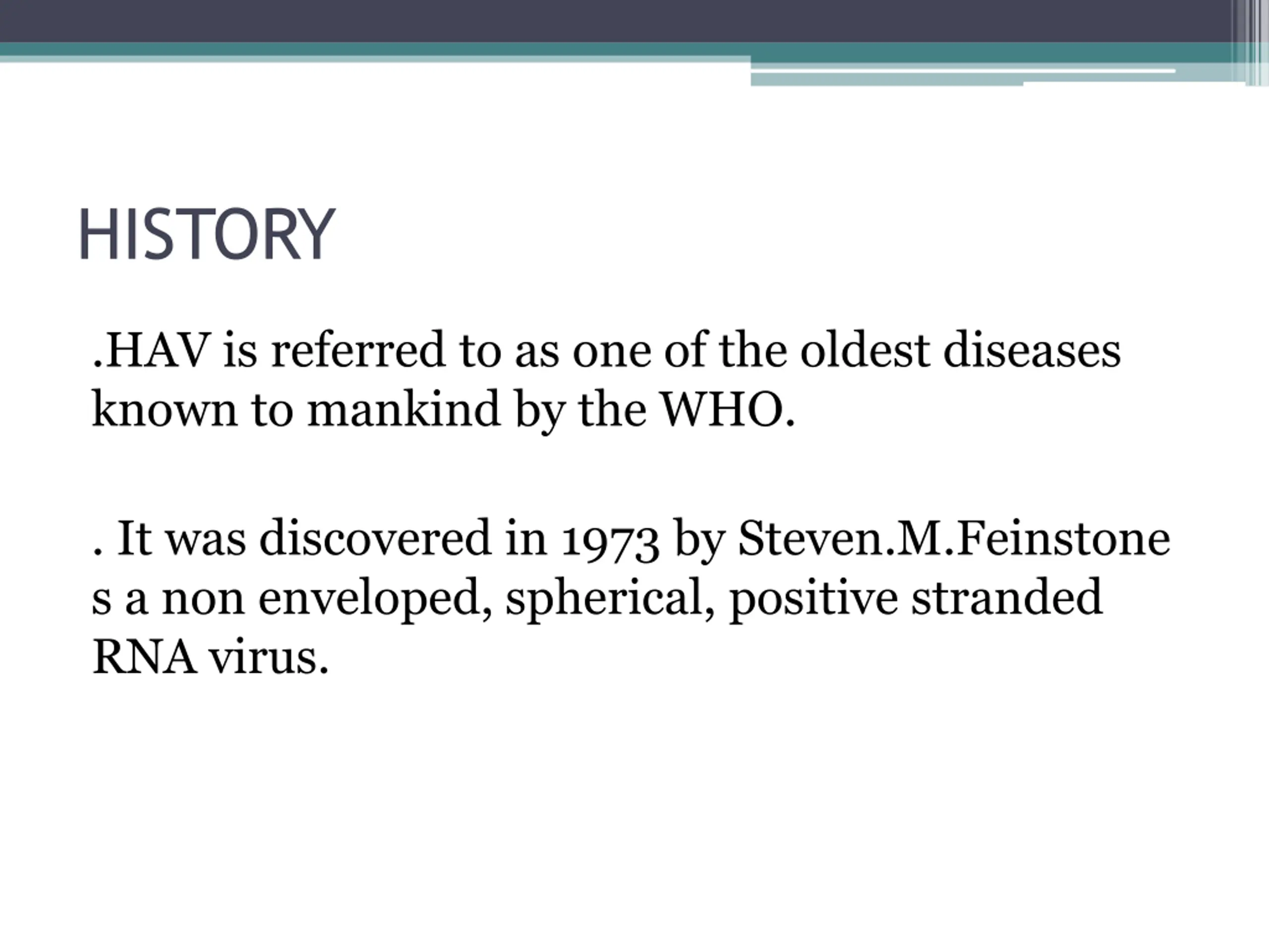 HISTORY .HAV is referred to as one of the oldest diseases known to mankind by the WHO. . It was discovered in 1973 by Steven.M.Feinstone s a non enveloped, spherical, positive stranded RNA virus.