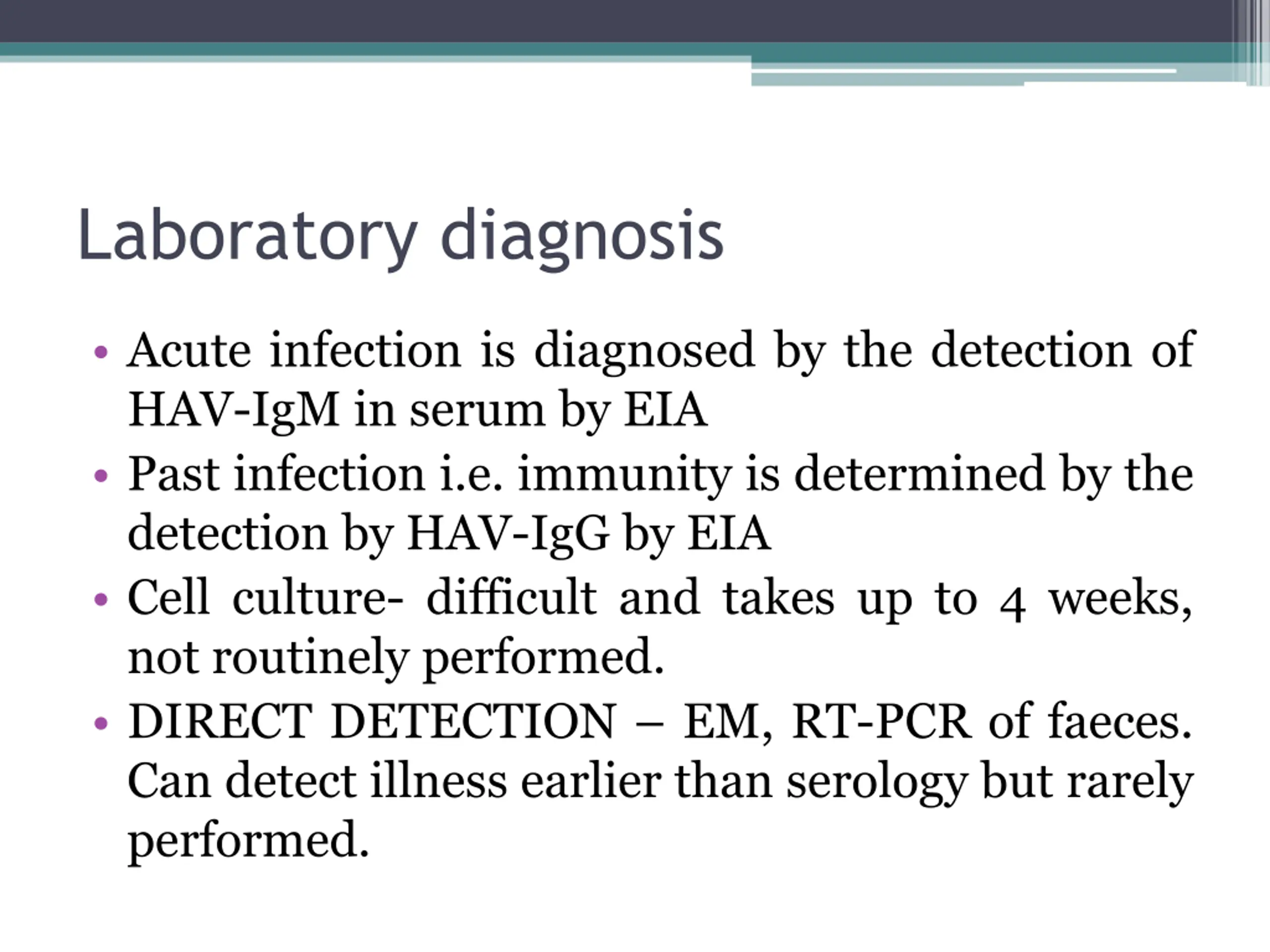 Laboratory diagnosis Acute infection is diagnosed by the detection of HAV-IgM in serum by EIA Past infection i.e. immunity is determined by the detection by HAV-IgG by EIA Cell culture- difficult and takes up to 4 weeks, not routinely performed. DIRECT DETECTION EM, RT-PCR of faeces. Can detect illness earlier than serology but rarely performed.