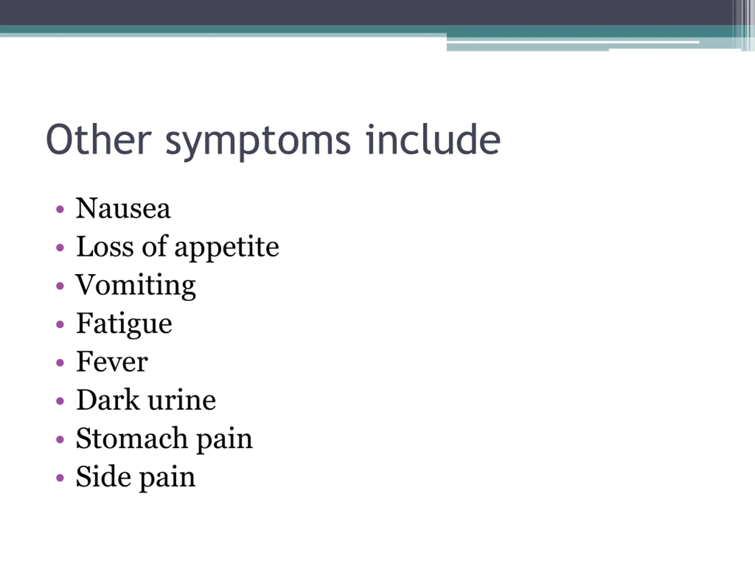 Other symptoms include Nausea Loss of appetite Vomiting Fatigue Fever Dark urine Stomach pain Side pain