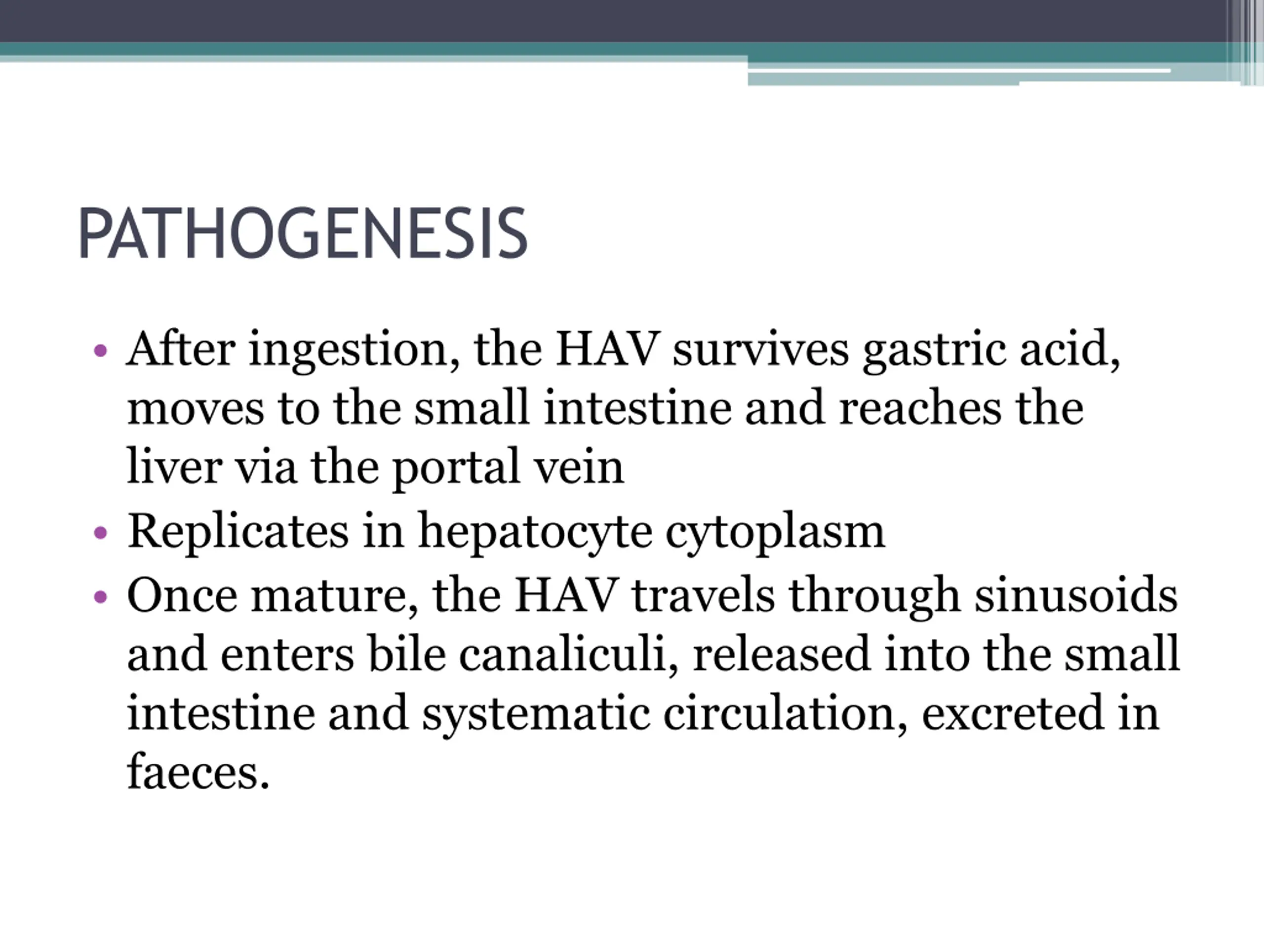 PATHOGENESIS After ingestion, the HAV survives gastric acid, moves to the small intestine and reaches the liver via the portal vein Replicates in hepatocyte cytoplasm Once mature, the HAV travels through sinusoids and enters bile canaliculi, released into the small intestine and systematic circulation, excreted in faeces.
