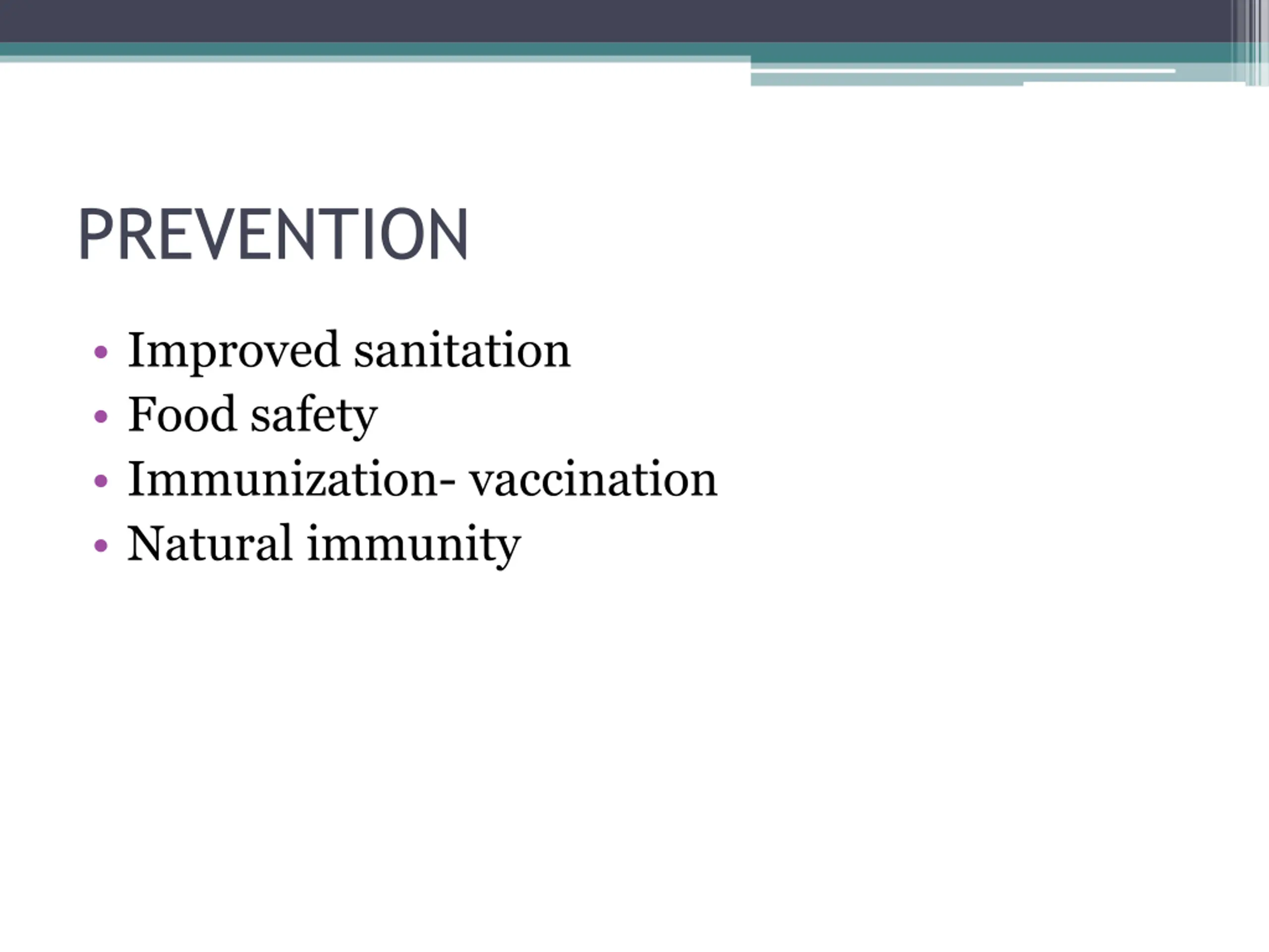 PREVENTION Improved sanitation Food safety Immunization- vaccination Natural immunity