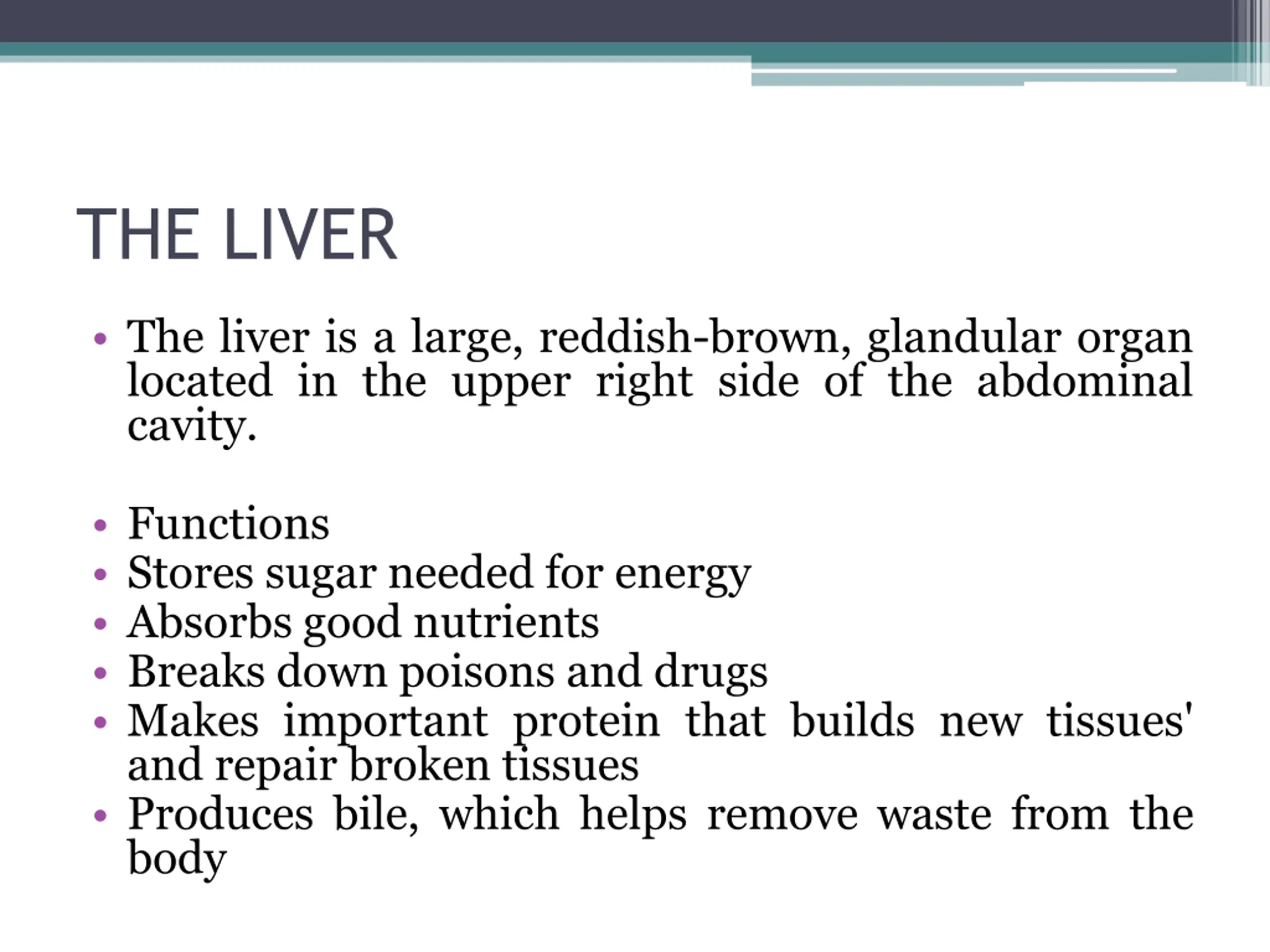 THE LIVER The liver is a large, reddish-brown, glandular organ located in the upper right side of the abdominal cavity. Functions Stores sugar needed for energy Absorbs good nutrients Breaks down poisons and drugs Makes important protein that builds new tissues' and repair broken tissues Produces bile, which helps remove waste from the body