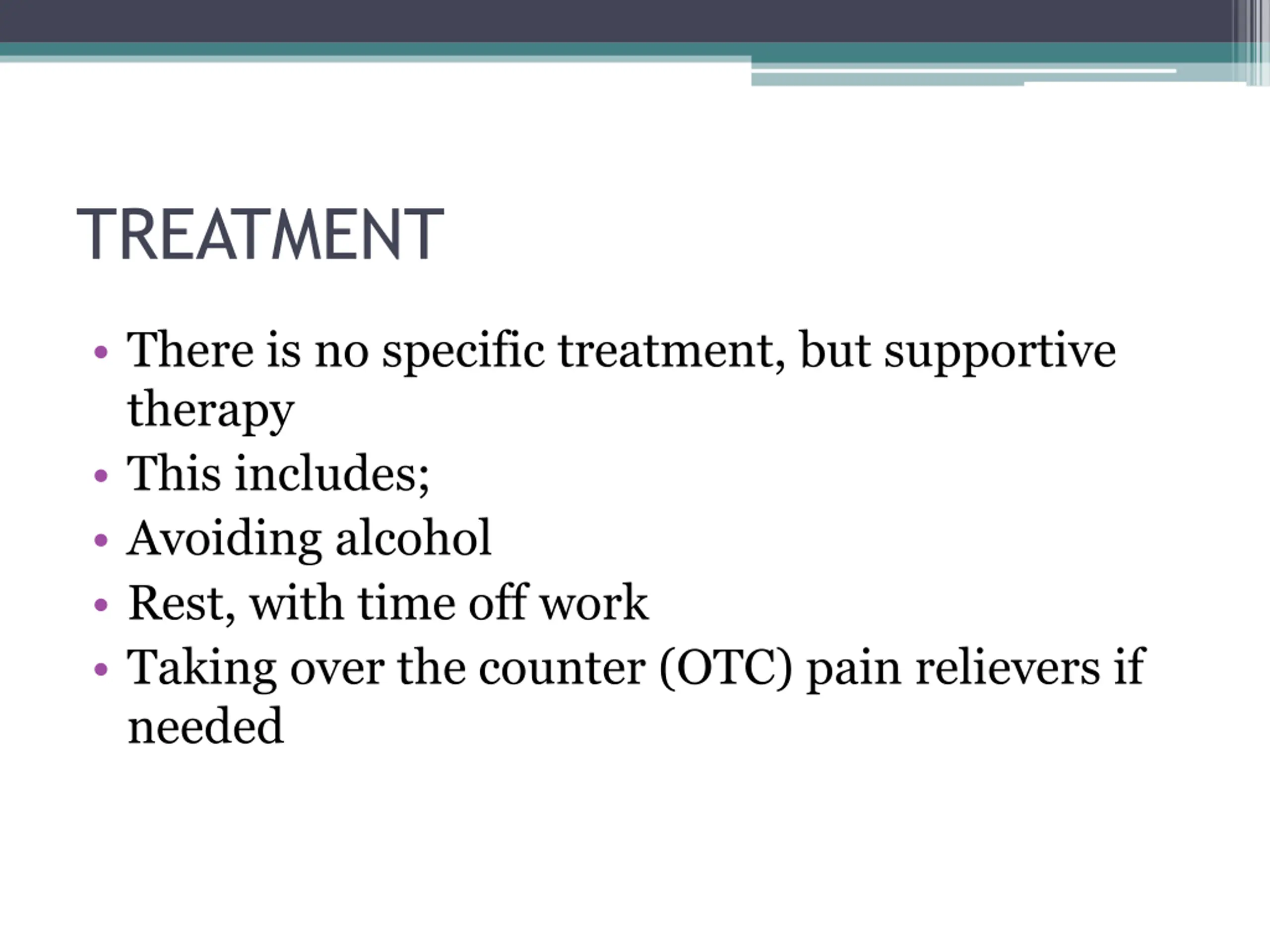 TREATMENT There is no specific treatment, but supportive therapy This includes; Avoiding alcohol Rest, with time off work Taking over the counter (OTC) pain relievers if needed