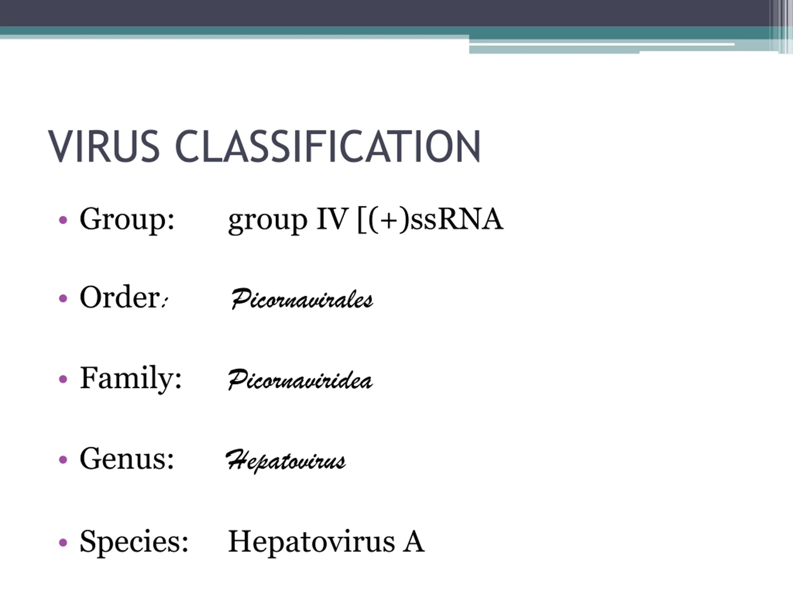 VIRUS CLASSIFICATION Group: group IV [(+)ssRNA Order: Picornavirales Family: Picornaviridea Genus: Hepatovirus Species: Hepatovirus A