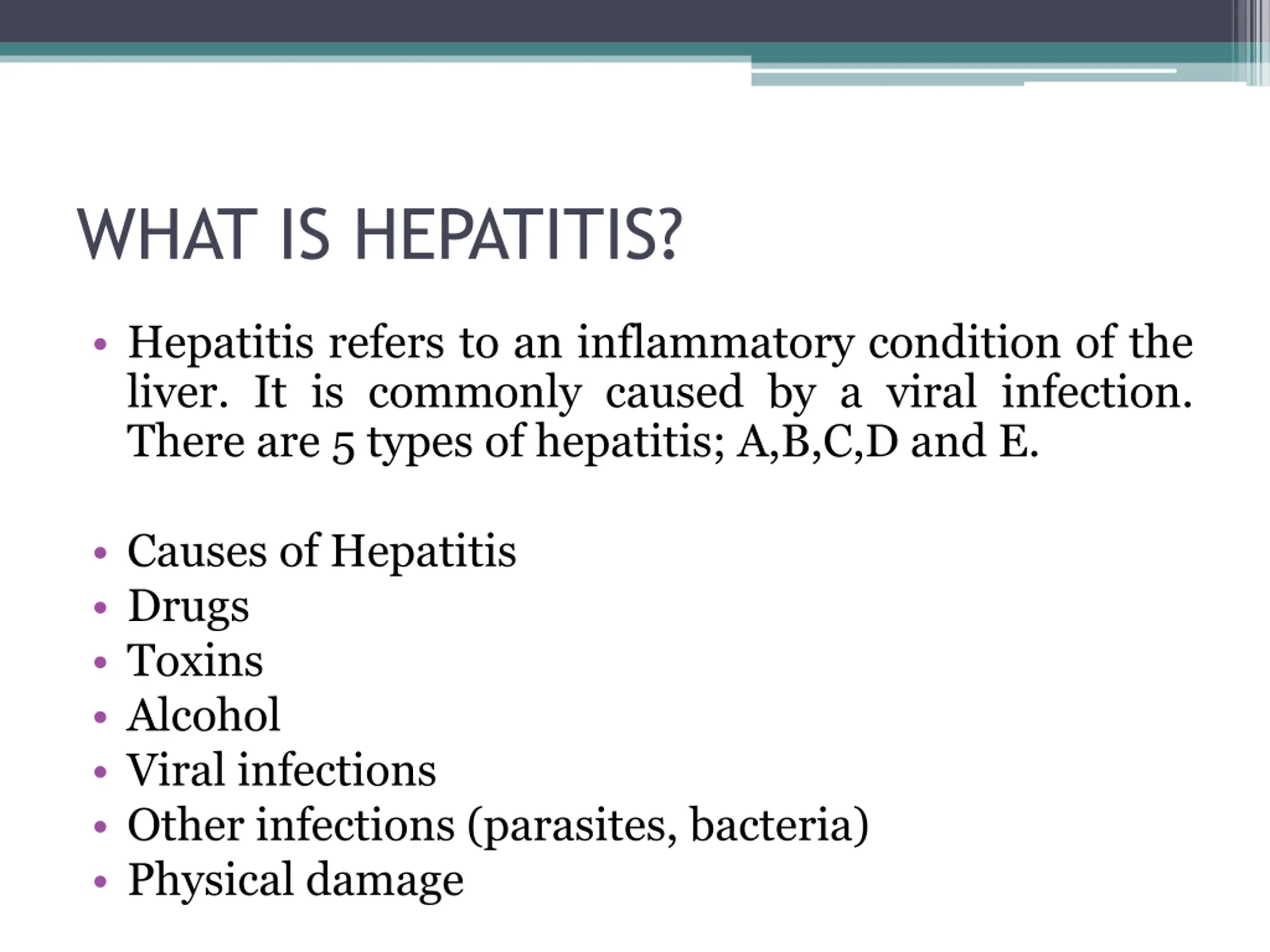 WHAT IS HEPATITIS? Hepatitis refers to an inflammatory condition of the liver. It is commonly caused by a viral infection. There are 5 types of hepatitis; A,B,C,D and E. Causes of Hepatitis Drugs Toxins Alcohol Viral infections Other infections (parasites, bacteria) Physical damage