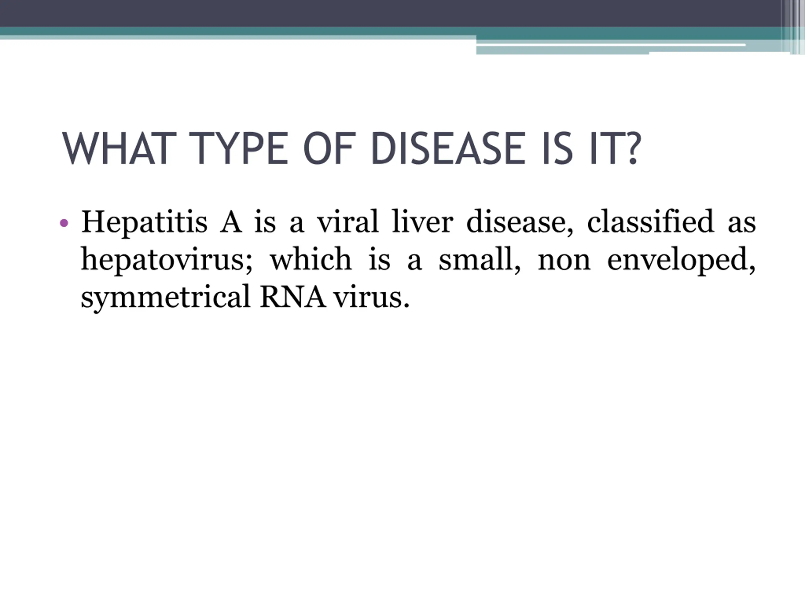 WHAT TYPE OF DISEASE IS IT? Hepatitis A is a viral liver disease, classified as hepatovirus; which is a small, non enveloped, symmetrical RNA virus.