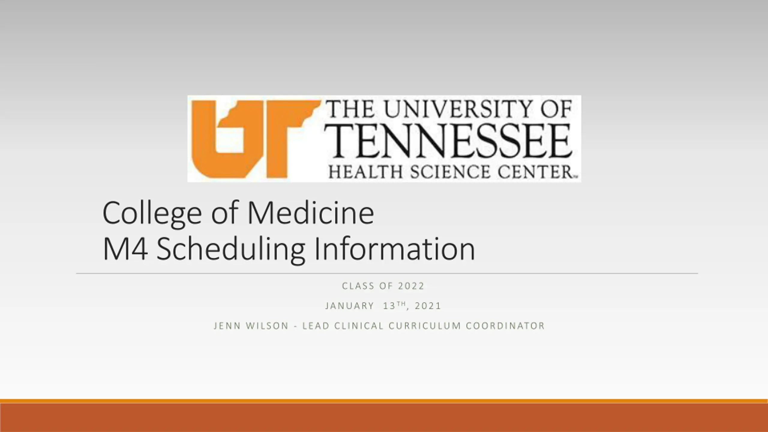 College of Medicine M4 Scheduling Information CLASS OF 2022 JANUARY 13TH, 2021 JENN WILSON - LEAD CLINICAL CURRICULUM COORDINATOR