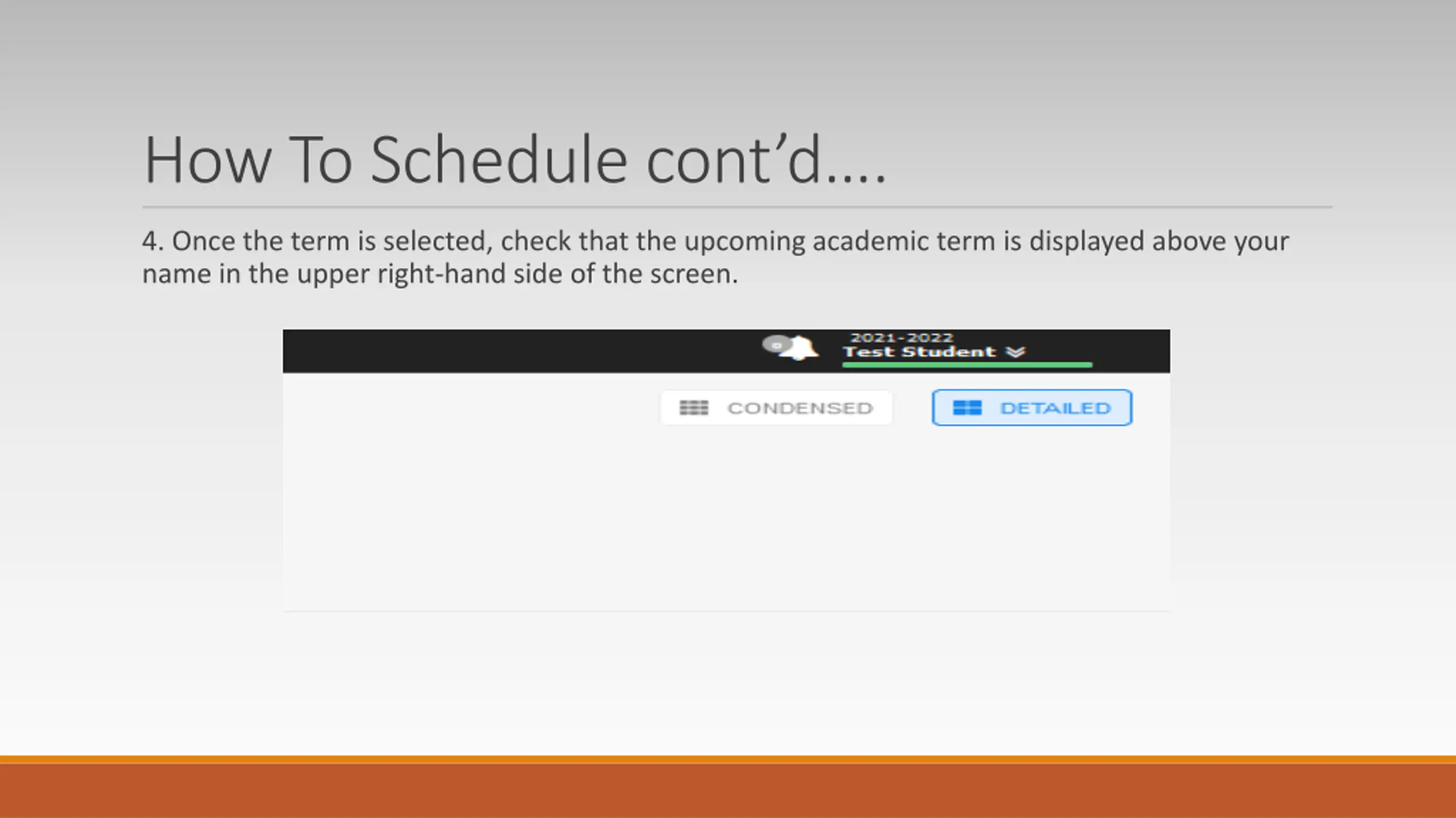 How To Schedule contd. 4. Once the term is selected, check that the upcoming academic term is displayed above your name in the upper right-hand side of the screen.