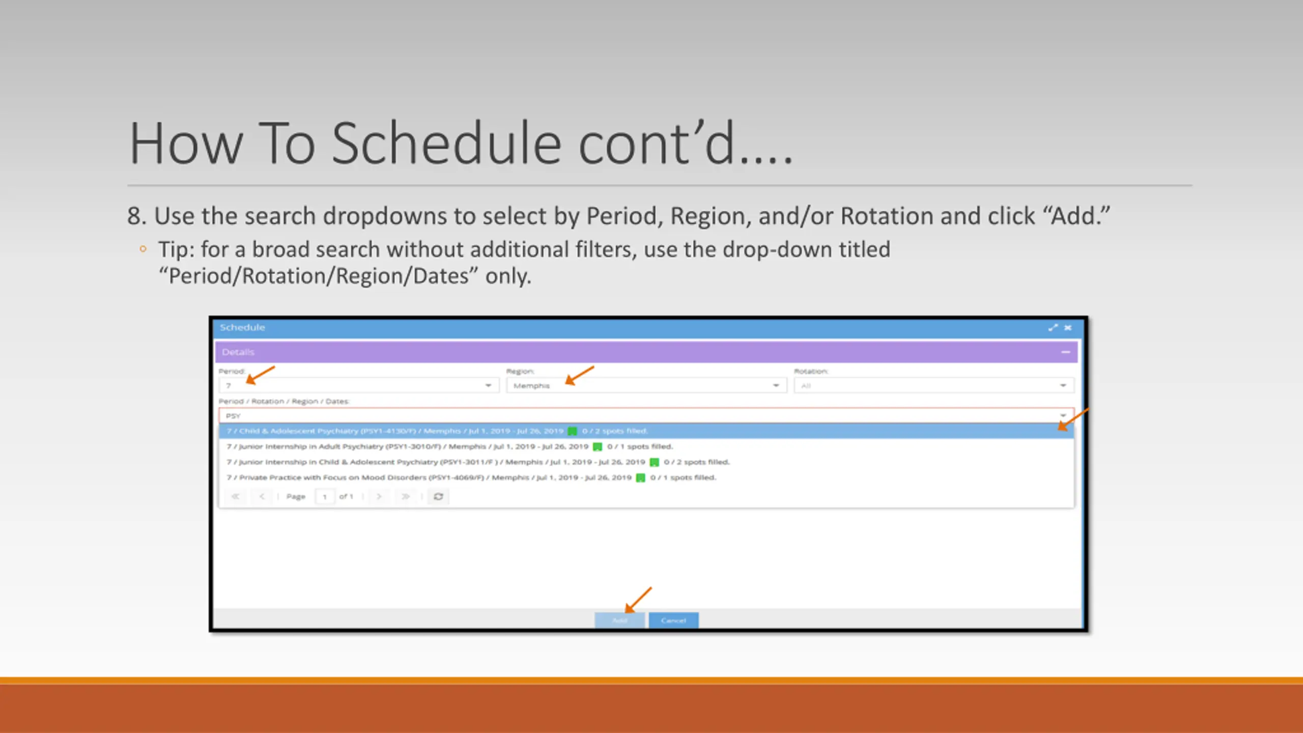 How To Schedule contd. 8. Use the search dropdowns to select by Period, Region, and/or Rotation and click Add. Tip: for a broad search without additional filters, use the drop-down titled Period/Rotation/Region/Dates only.