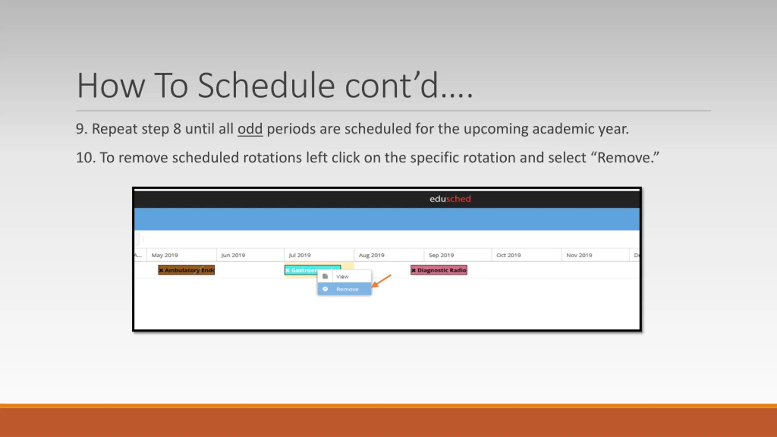 How To Schedule contd. 9. Repeat step 8 until all odd periods are scheduled for the upcoming academic year. 10. To remove scheduled rotations left click on the specific rotation and select Remove.