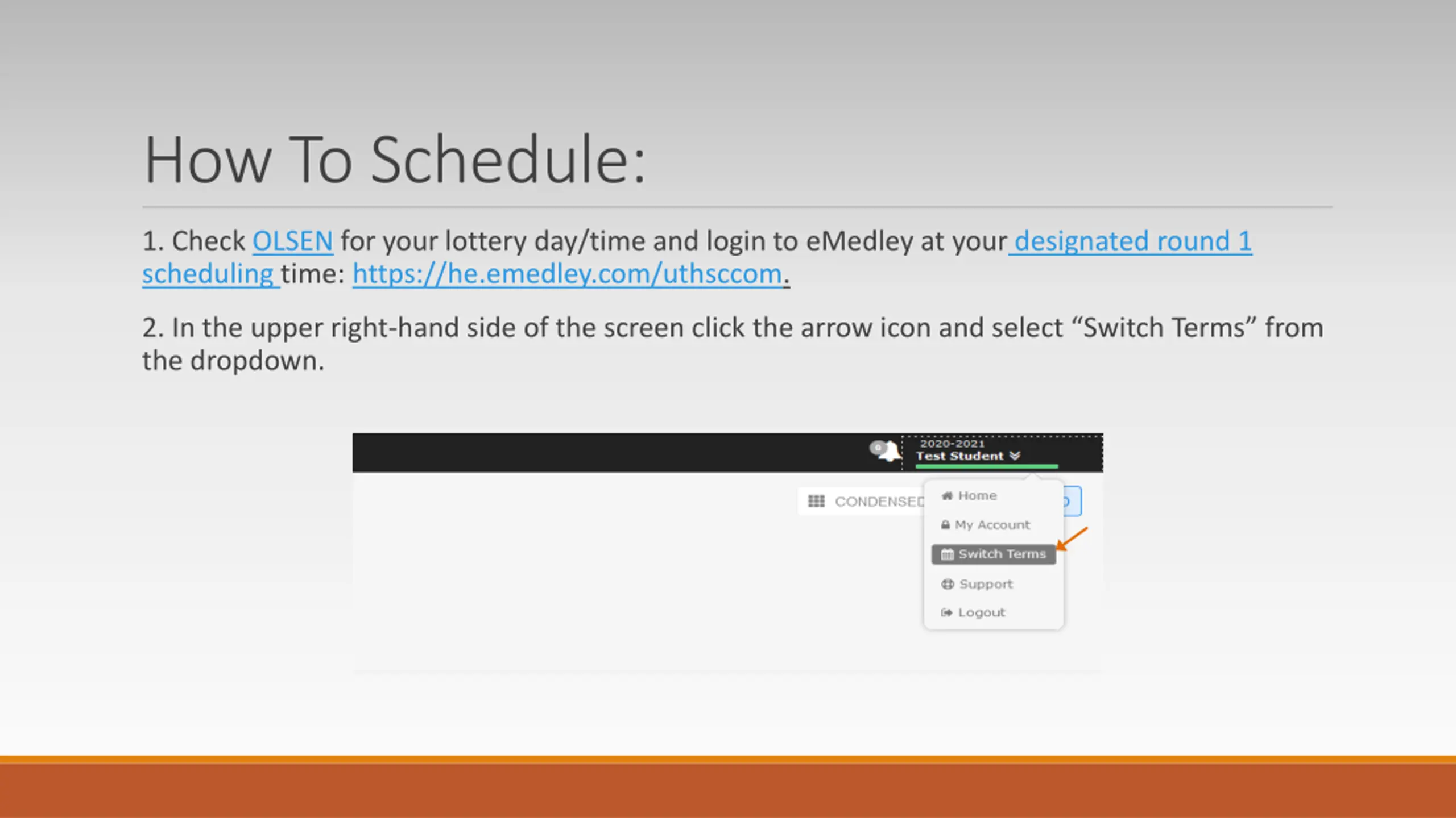 How To Schedule: 1. Check OLSEN for your lottery day/time and login to eMedley at your designated round 1 scheduling time: https://he.emedley.com/uthsccom. 2. In the upper right-hand side of the screen click the arrow icon and select Switch Terms from the dropdown.