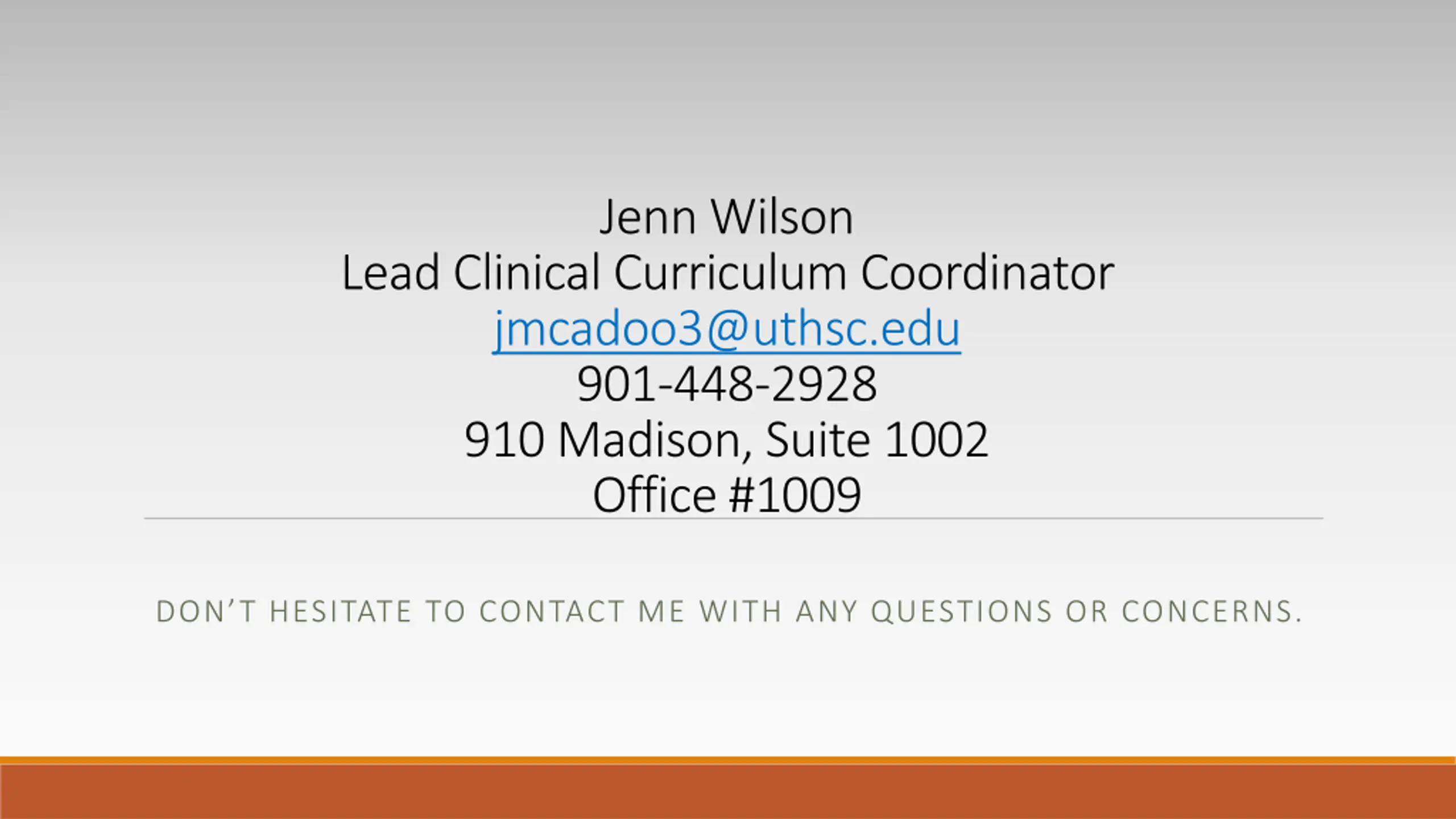 Jenn Wilson Lead Clinical Curriculum Coordinator jmcadoo3@uthsc.edu 901-448-2928 910 Madison, Suite 1002 Office #1009 DON T HESITATE TO CONTACT ME WITH ANY QUESTIONS OR CONCERNS.