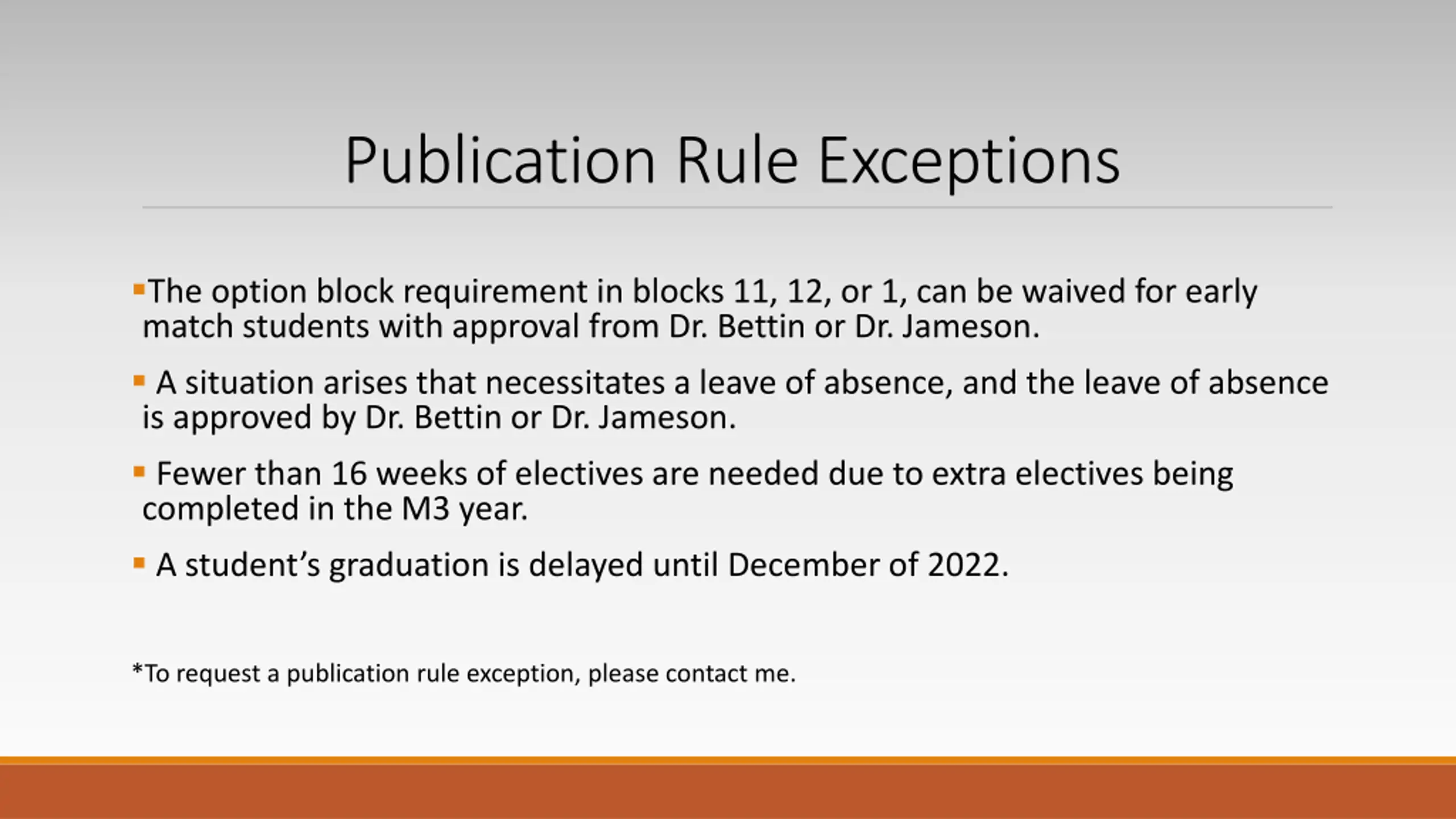 Publication Rule Exceptions The option block requirement in blocks 11, 12, or 1, can be waived for early match students with approval from Dr. Bettin or Dr. Jameson. A situation arises that necessitates a leave of absence, and the leave of absence is approved by Dr. Bettin or Dr. Jameson. Fewer than 16 weeks of electives are needed due to extra electives being completed in the M3 year. A student s graduation is delayed until December of 2022. *To request a publication rule exception, please contact me.