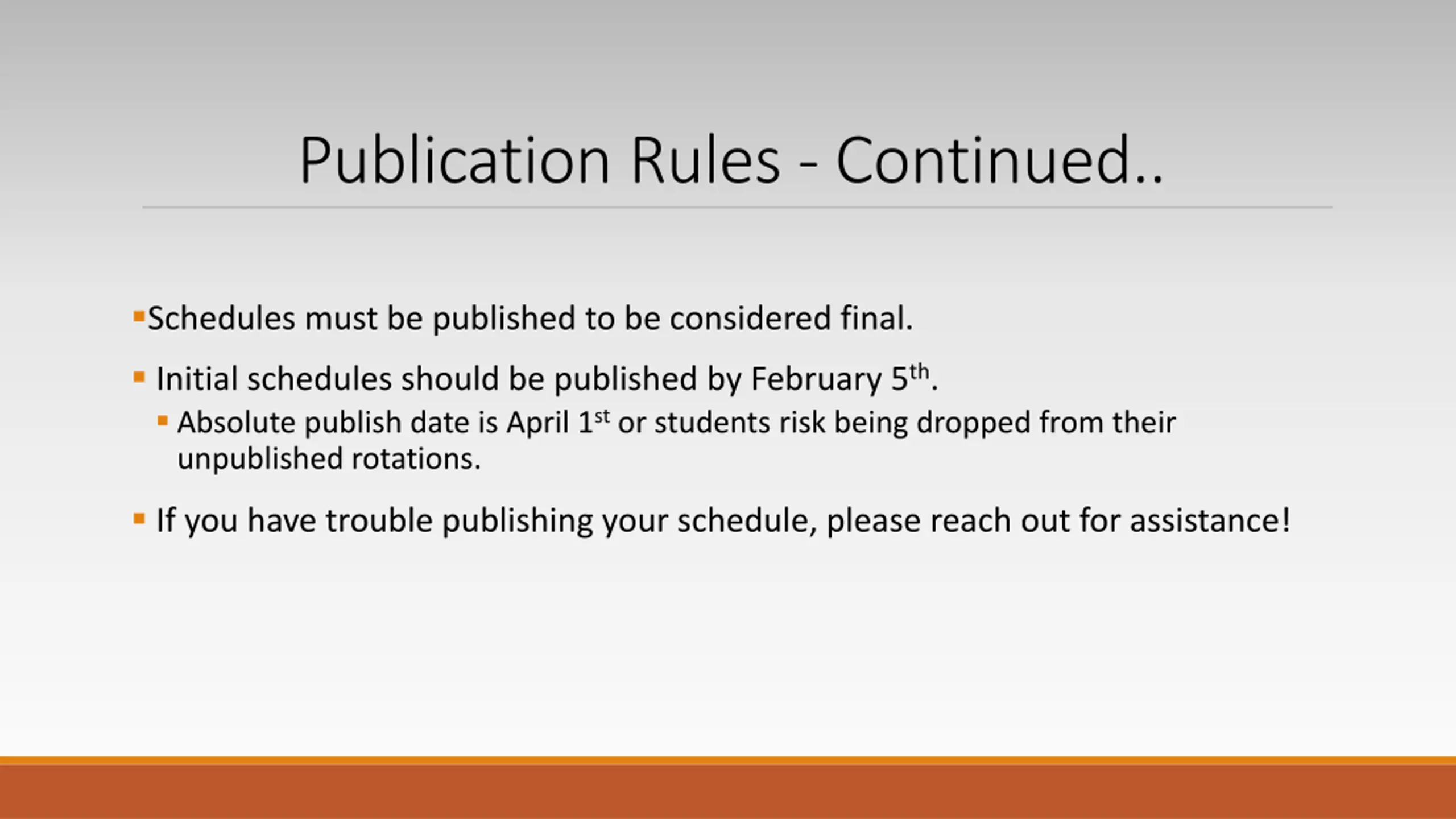 Publication Rules - Continued.. Schedules must be published to be considered final. Initial schedules should be published by February 5th. Absolute publish date is April 1stor students risk being dropped from their unpublished rotations. If you have trouble publishing your schedule, please reach out for assistance!