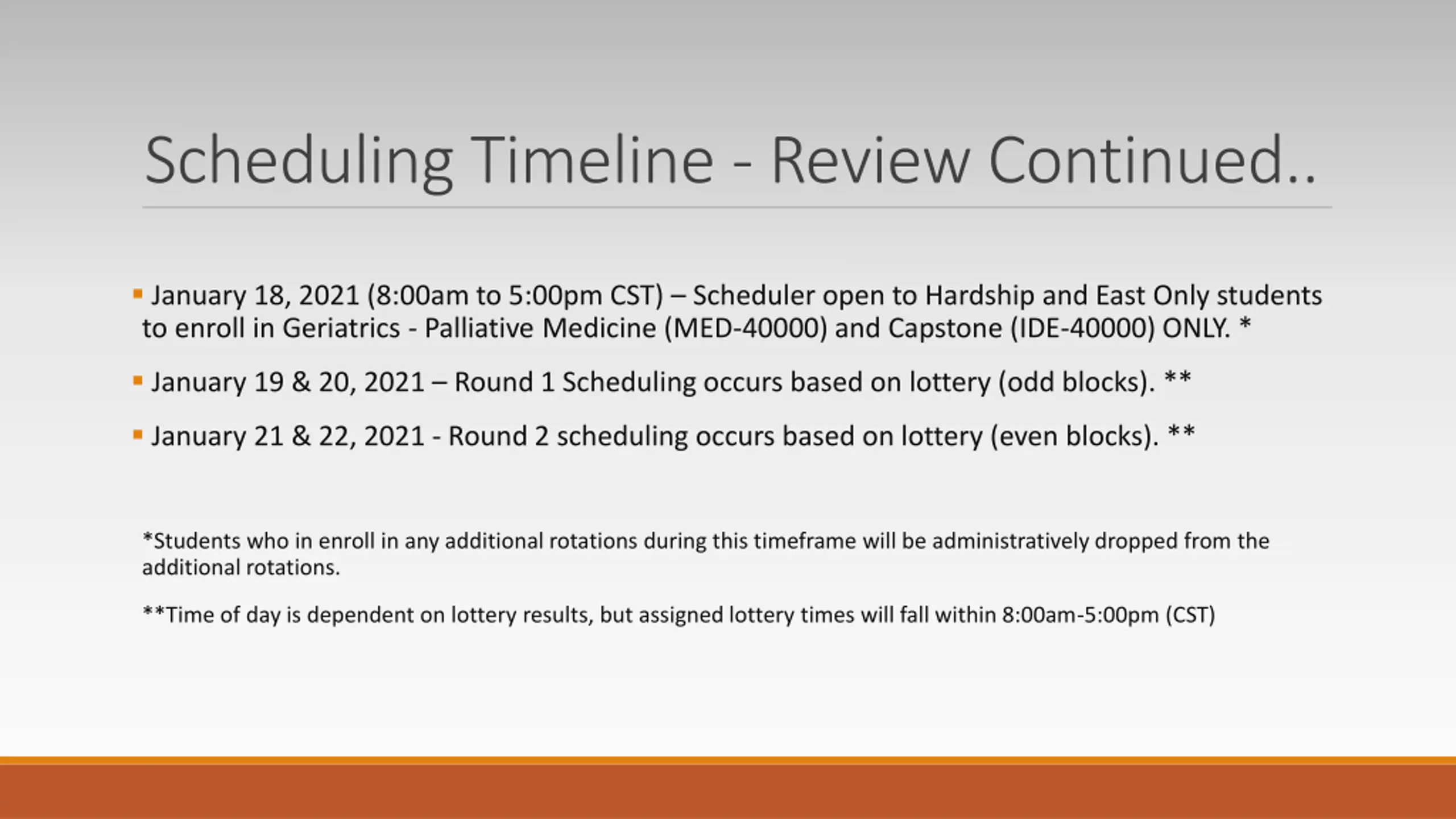 Scheduling Timeline - Review Continued.. January 18, 2021 (8:00am to 5:00pm CST) Scheduler open to Hardship and East Only students to enroll in Geriatrics - Palliative Medicine (MED-40000) and Capstone (IDE-40000) ONLY. * January 19 & 20, 2021 Round 1 Scheduling occurs based on lottery (odd blocks). ** January 21 & 22, 2021 - Round 2 scheduling occurs based on lottery (even blocks). ** *Students who in enroll in any additional rotations during this timeframe will be administratively dropped from the additional rotations. **Time of day is dependent on lottery results, but assigned lottery times will fall within 8:00am-5:00pm (CST)