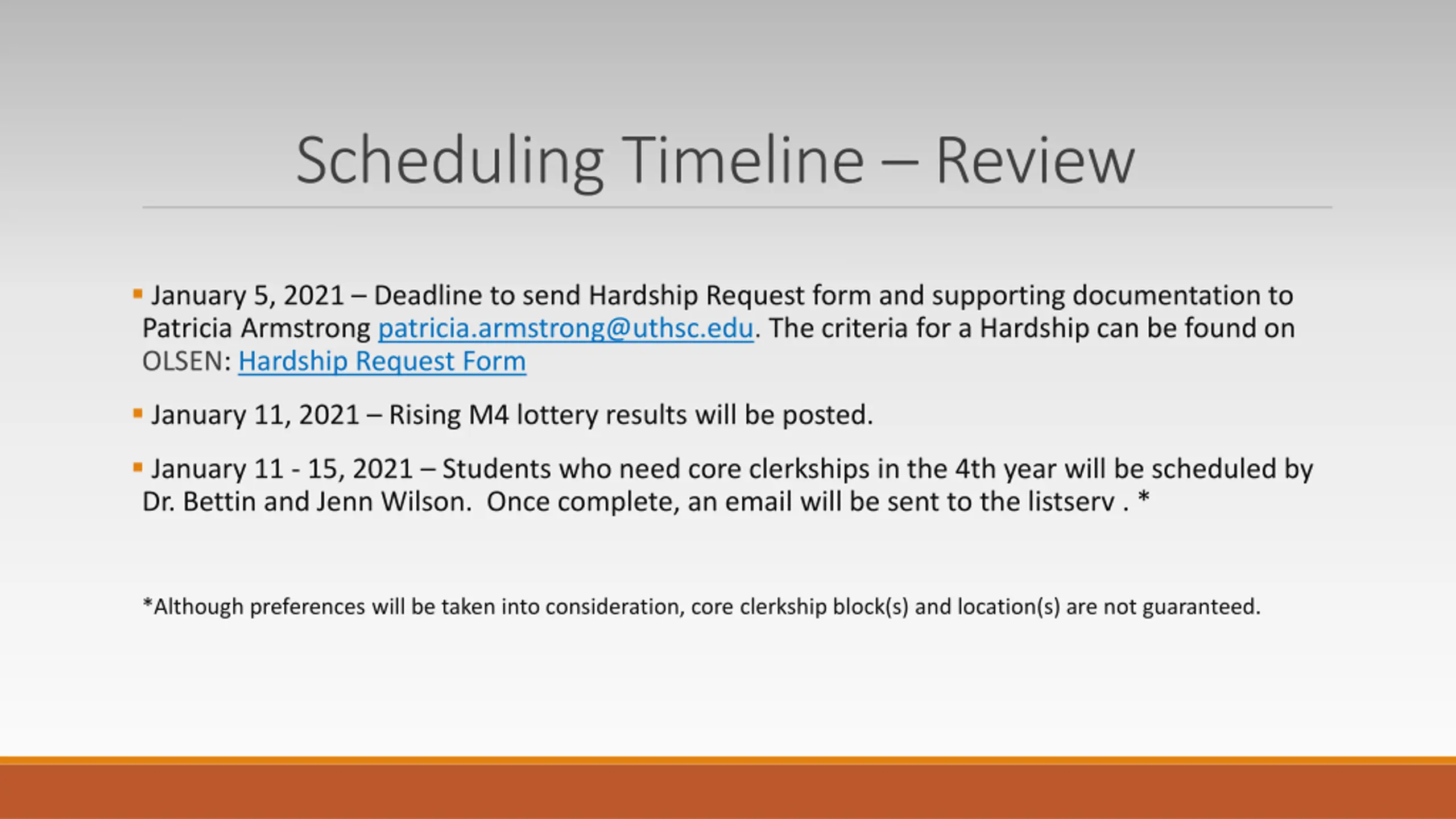 Scheduling Timeline Review January 5, 2021 Deadline to send Hardship Request form and supporting documentation to Patricia Armstrong patricia.armstrong@uthsc.edu. The criteria for a Hardship can be found on OLSEN: Hardship Request Form January 11, 2021 Rising M4 lottery results will be posted. January 11 - 15, 2021 Students who need core clerkships in the 4th year will be scheduled by Dr. Bettin and Jenn Wilson. Once complete, an email will be sent to the listserv . * *Although preferences will be taken into consideration, core clerkship block(s) and location(s) are not guaranteed.