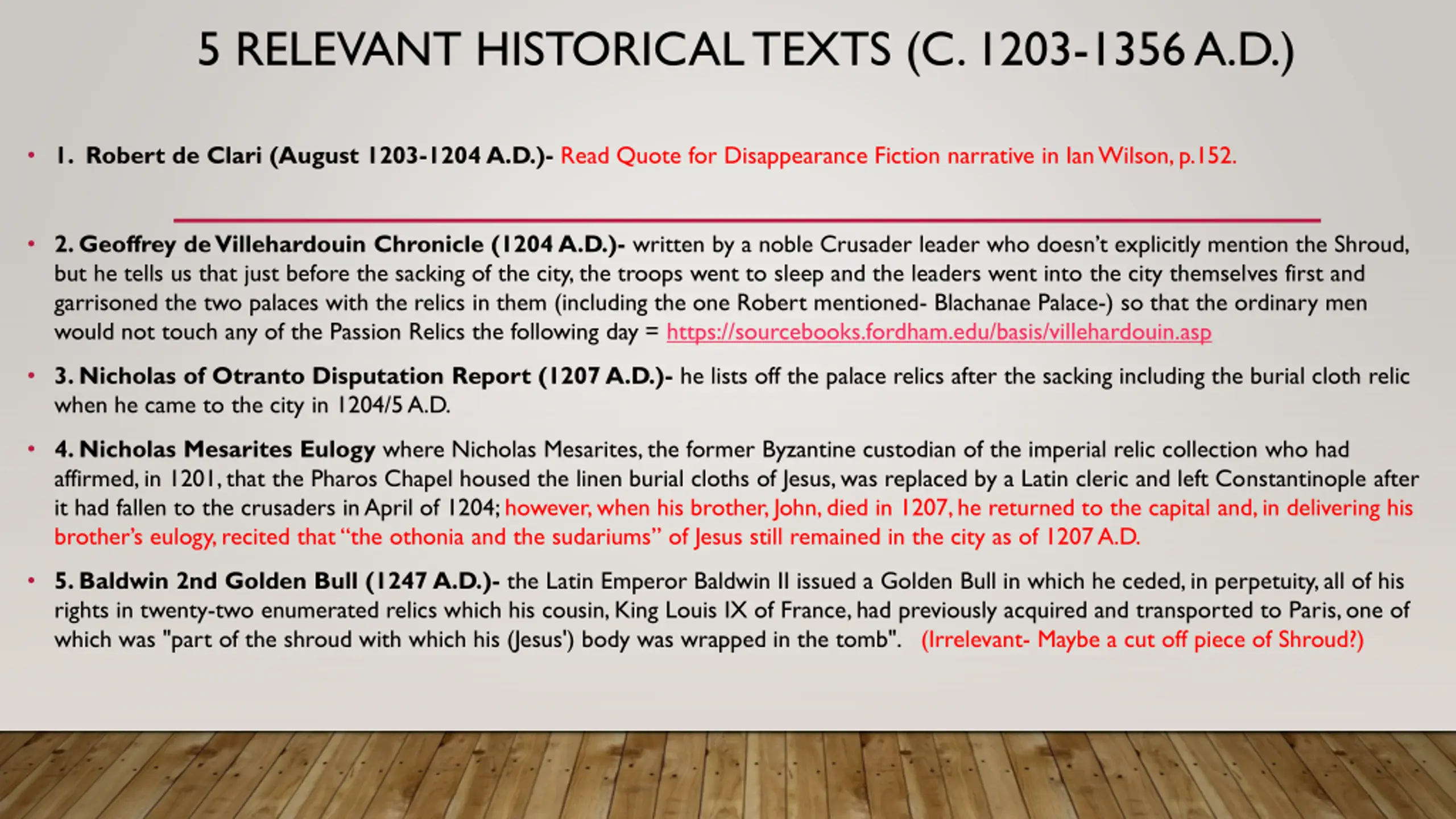 5 RELEVANT HISTORICAL TEXTS (C. 1203-1356 A.D.) 1. Robert de Clari (August 1203-1204 A.D.)- Read Quote for Disappearance Fiction narrative in Ian Wilson, p.152. 2. Geoffrey de Villehardouin Chronicle (1204 A.D.)- written by a noble Crusader leader who doesn t explicitly mention the Shroud, but he tells us that just before the sacking of the city, the troops went to sleep and the leaders went into the city themselves first and garrisoned the two palaces with the relics in them (including the one Robert mentioned- Blachanae Palace-) so that the ordinary men would not touch any of the Passion Relics the following day = https://sourcebooks.fordham.edu/basis/villehardouin.asp 3. Nicholas of Otranto Disputation Report (1207 A.D.)- he lists off the palace relics after the sacking including the burial cloth relic when he came to the city in 1204/5 A.D. 4. Nicholas Mesarites Eulogy where Nicholas Mesarites, the former Byzantine custodian of the imperial relic collection who had affirmed, in 1201, that the Pharos Chapel housed the linen burial cloths of Jesus, was replaced by a Latin cleric and left Constantinople after it had fallen to the crusaders in April of 1204; however, when his brother, John, died in 1207, he returned to the capital and, in delivering his brother s eulogy, recited that the othonia and the sudariums of Jesus still remained in the city as of 1207 A.D. 5. Baldwin 2nd Golden Bull (1247 A.D.)- the Latin Emperor Baldwin II issued a Golden Bull in which he ceded, in perpetuity, all of his rights in twenty-two enumerated relics which his cousin, King Louis IX of France, had previously acquired and transported to Paris, one of which was "part of the shroud with which his (Jesus') body was wrapped in the tomb". (Irrelevant- Maybe a cut off piece of Shroud?)