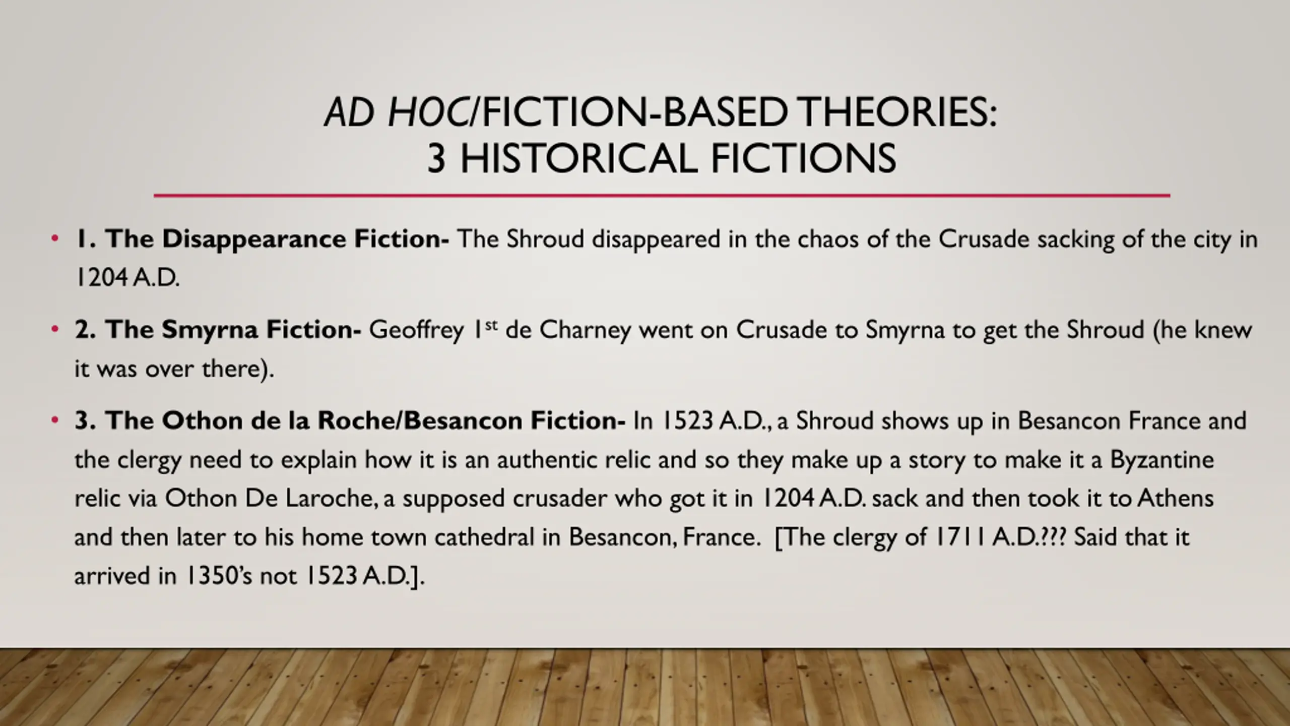 AD HOC/FICTION-BASED THEORIES: 3 HISTORICAL FICTIONS 1. The Disappearance Fiction- The Shroud disappeared in the chaos of the Crusade sacking of the city in 1204 A.D. 2. The Smyrna Fiction- Geoffrey 1st de Charney went on Crusade to Smyrna to get the Shroud (he knew it was over there). 3. The Othon de la Roche/Besancon Fiction- In 1523 A.D., a Shroud shows up in Besancon France and the clergy need to explain how it is an authentic relic and so they make up a story to make it a Byzantine relic via Othon De Laroche, a supposed crusader who got it in 1204 A.D. sack and then took it to Athens and then later to his home town cathedral in Besancon, France. [The clergy of 1711 A.D.??? Said that it arrived in 1350 s not 1523 A.D.].