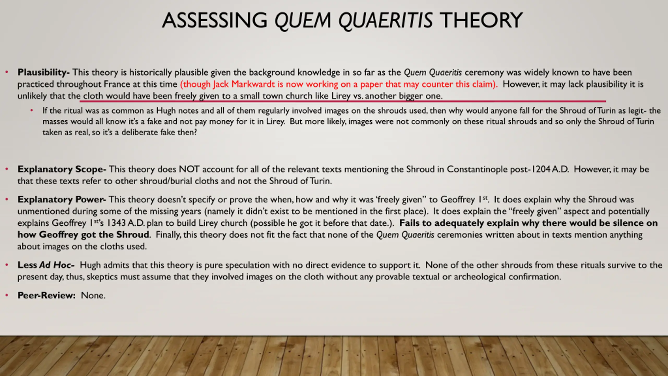 ASSESSING QUEM QUAERITIS THEORY Plausibility- This theory is historically plausible given the background knowledge in so far as the Quem Quaeritis ceremony was widely known to have been practiced throughout France at this time (though Jack Markwardt is now working on a paper that may counter this claim). However, it may lack plausibility it is unlikely that the cloth would have been freely given to a small town church like Lirey vs. another bigger one. If the ritual was as common as Hugh notes and all of them regularly involved images on the shrouds used, then why would anyone fall for the Shroud of Turin as legit- the masses would all know it s a fake and not pay money for it in Lirey. But more likely, images were not commonly on these ritual shrouds and so only the Shroud of Turin taken as real, so it s a deliberate fake then? Explanatory Scope- This theory does NOT account for all of the relevant texts mentioning the Shroud in Constantinople post-1204 A.D. However, it may be that these texts refer to other shroud/burial cloths and not the Shroud of Turin. Explanatory Power- This theory doesn t specify or prove the when, how and why it was freely given to Geoffrey 1st. It does explain why the Shroud was unmentioned during some of the missing years (namely it didn t exist to be mentioned in the first place). It does explain the freely given aspect and potentially explains Geoffrey 1st s 1343 A.D. plan to build Lirey church (possible he got it before that date.). Fails to adequately explain why there would be silence on how Geoffrey got the Shroud. Finally, this theory does not fit the fact that none of the Quem Quaeritis ceremonies written about in texts mention anything about images on the cloths used. LessAd Hoc- Hugh admits that this theory is pure speculation with no direct evidence to support it. None of the other shrouds from these rituals survive to the present day, thus, skeptics must assume that they involved images on the cloth without any provable textual or archeological confirmation. Peer-Review: None.