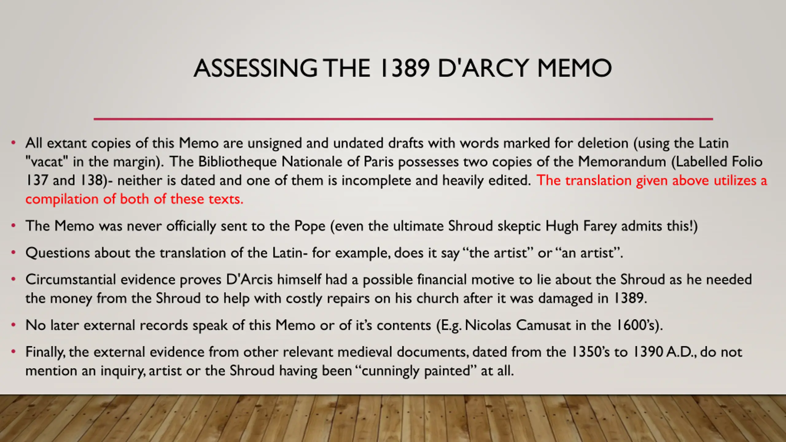 ASSESSING THE 1389 D'ARCY MEMO All extant copies of this Memo are unsigned and undated drafts with words marked for deletion (using the Latin "vacat" in the margin). The Bibliotheque Nationale of Paris possesses two copies of the Memorandum (Labelled Folio 137 and 138)- neither is dated and one of them is incomplete and heavily edited. The translation given above utilizes a compilation of both of these texts. The Memo was never officially sent to the Pope (even the ultimate Shroud skeptic Hugh Farey admits this!) Questions about the translation of the Latin- for example, does it say the artist or an artist . Circumstantial evidence proves D'Arcis himself had a possible financial motive to lie about the Shroud as he needed the money from the Shroud to help with costly repairs on his church after it was damaged in 1389. No later external records speak of this Memo or of it s contents (E.g. Nicolas Camusat in the 1600 s). Finally, the external evidence from other relevant medieval documents, dated from the 1350 s to 1390 A.D., do not mention an inquiry, artist or the Shroud having been cunningly painted at all.