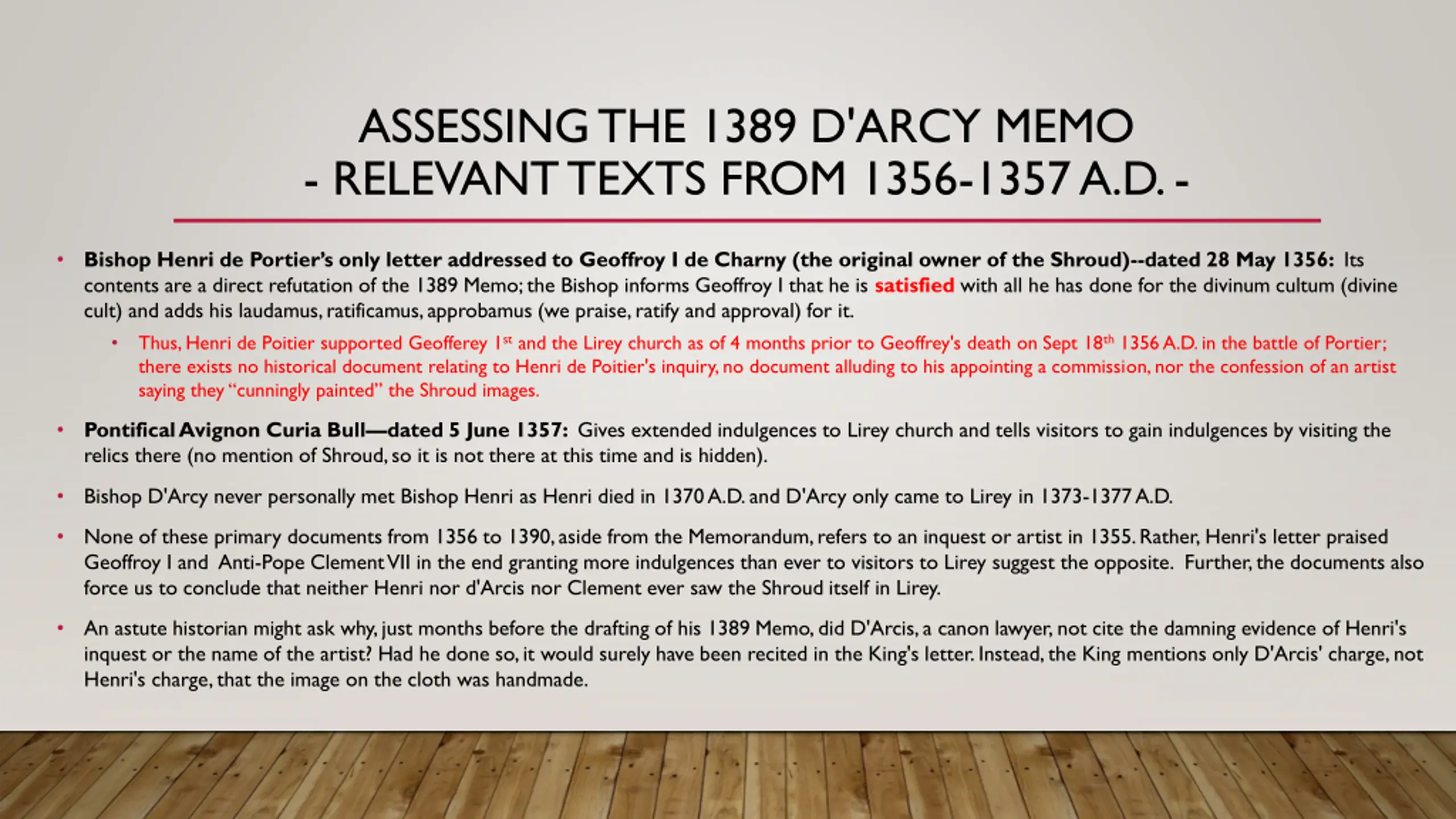 ASSESSING THE 1389 D'ARCY MEMO - RELEVANT TEXTS FROM 1356-1357 A.D. - Bishop Henri de Portier s only letter addressed to Geoffroy I de Charny (the original owner of the Shroud)--dated 28 May 1356: Its contents are a direct refutation of the 1389 Memo; the Bishop informs Geoffroy I that he is satisfied with all he has done for the divinum cultum (divine cult) and adds his laudamus, ratificamus, approbamus (we praise, ratify and approval) for it. Thus, Henri de Poitier supported Geofferey 1stand the Lirey church as of 4 months prior to Geoffrey's death on Sept 18th1356 A.D. in the battle of Portier; there exists no historical document relating to Henri de Poitier's inquiry, no document alluding to his appointing a commission,nor the confession of an artist saying they cunningly painted the Shroud images. Pontifical Avignon Curia Bull dated 5 June 1357: Gives extended indulgences to Lirey church and tells visitors to gain indulgences by visiting the relics there (no mention of Shroud, so it is not there at this time and is hidden). Bishop D'Arcy never personally met Bishop Henri as Henri died in 1370 A.D. and D'Arcy only came to Lirey in 1373-1377 A.D. None of these primary documents from 1356 to 1390, aside from the Memorandum, refers to an inquest or artist in 1355. Rather, Henri's letter praised Geoffroy I and Anti-Pope Clement VII in the end granting more indulgences than ever to visitors to Lirey suggest the opposite. Further, the documents also force us to conclude that neither Henri nor d'Arcis nor Clement ever saw the Shroud itself in Lirey. An astute historian might ask why, just months before the drafting of his 1389 Memo, did D'Arcis, a canon lawyer, not cite the damning evidence of Henri's inquest or the name of the artist? Had he done so, it would surely have been recited in the King's letter. Instead, the King mentions only D'Arcis' charge, not Henri's charge, that the image on the cloth was handmade.
