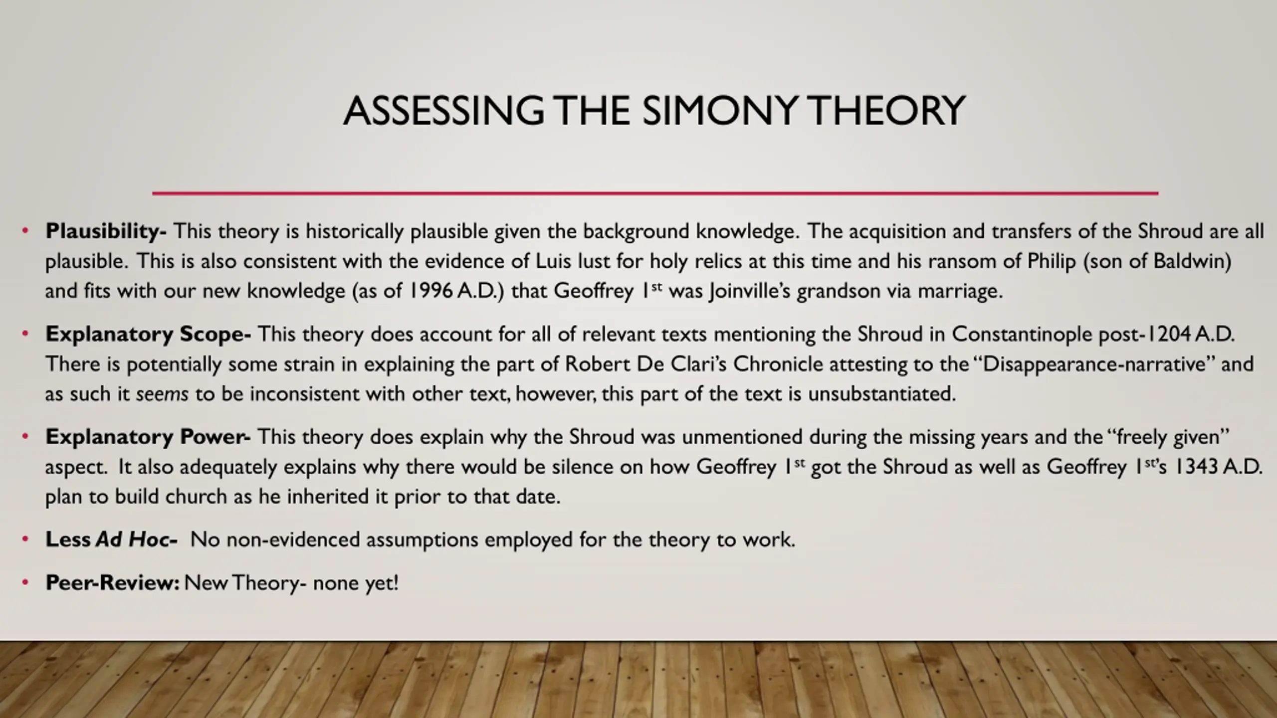 ASSESSING THE SIMONY THEORY Plausibility- This theory is historically plausible given the background knowledge. The acquisition and transfers of the Shroud are all plausible. This is also consistent with the evidence of Luis lust for holy relics at this time and his ransom of Philip (son of Baldwin) and fits with our new knowledge (as of 1996 A.D.) that Geoffrey 1stwas Joinville s grandson via marriage. Explanatory Scope- This theory does account for all of relevant texts mentioning the Shroud in Constantinople post-1204 A.D. There is potentially some strain in explaining the part of Robert De Clari s Chronicle attesting to the Disappearance-narrative and as such it seems to be inconsistent with other text, however, this part of the text is unsubstantiated. Explanatory Power- This theory does explain why the Shroud was unmentioned during the missing years and the freely given aspect. It also adequately explains why there would be silence on how Geoffrey 1stgot the Shroud as well as Geoffrey 1st s 1343 A.D. plan to build church as he inherited it prior to that date. Less Ad Hoc- No non-evidenced assumptions employed for the theory to work. Peer-Review: New Theory- none yet!