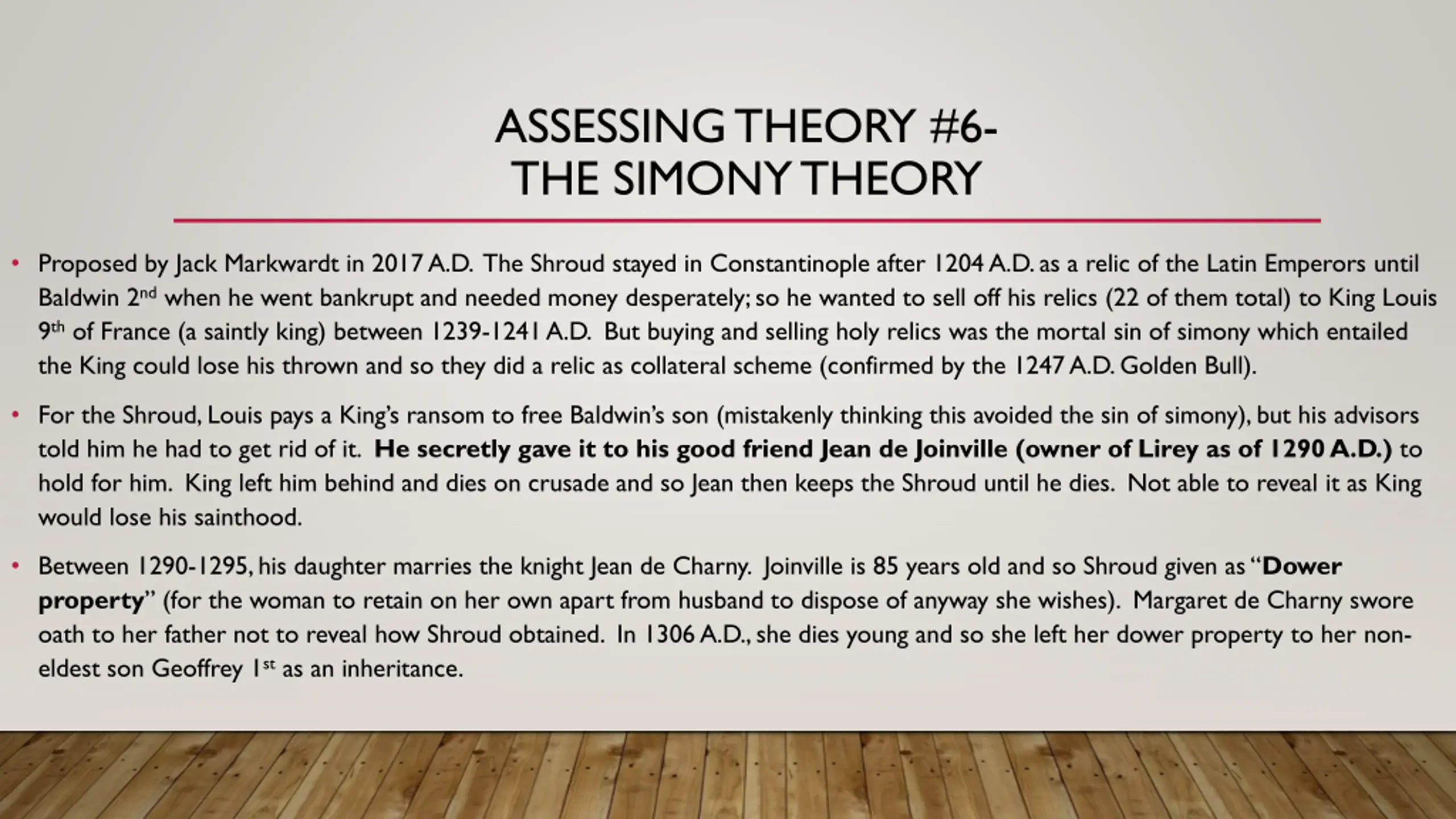 ASSESSING THEORY #6- THE SIMONY THEORY Proposed by Jack Markwardt in 2017 A.D. The Shroud stayed in Constantinople after 1204 A.D. as a relic of the Latin Emperors until Baldwin 2ndwhen he went bankrupt and needed money desperately; so he wanted to sell off his relics (22 of them total) to King Louis 9thof France (a saintly king) between 1239-1241 A.D. But buying and selling holy relics was the mortal sin of simony which entailed the King could lose his thrown and so they did a relic as collateral scheme (confirmed by the 1247 A.D. Golden Bull). For the Shroud, Louis pays a King s ransom to free Baldwin s son (mistakenly thinking this avoided the sin of simony), but his advisors told him he had to get rid of it. He secretly gave it to his good friend Jean de Joinville (owner of Lirey as of 1290 A.D.) to hold for him. King left him behind and dies on crusade and so Jean then keeps the Shroud until he dies. Not able to reveal it as King would lose his sainthood. Between 1290-1295, his daughter marries the knight Jean de Charny. Joinville is 85 years old and so Shroud given as Dower property (for the woman to retain on her own apart from husband to dispose of anyway she wishes). Margaret de Charny swore oath to her father not to reveal how Shroud obtained. In 1306 A.D., she dies young and so she left her dower property to her non- eldest son Geoffrey 1stas an inheritance.