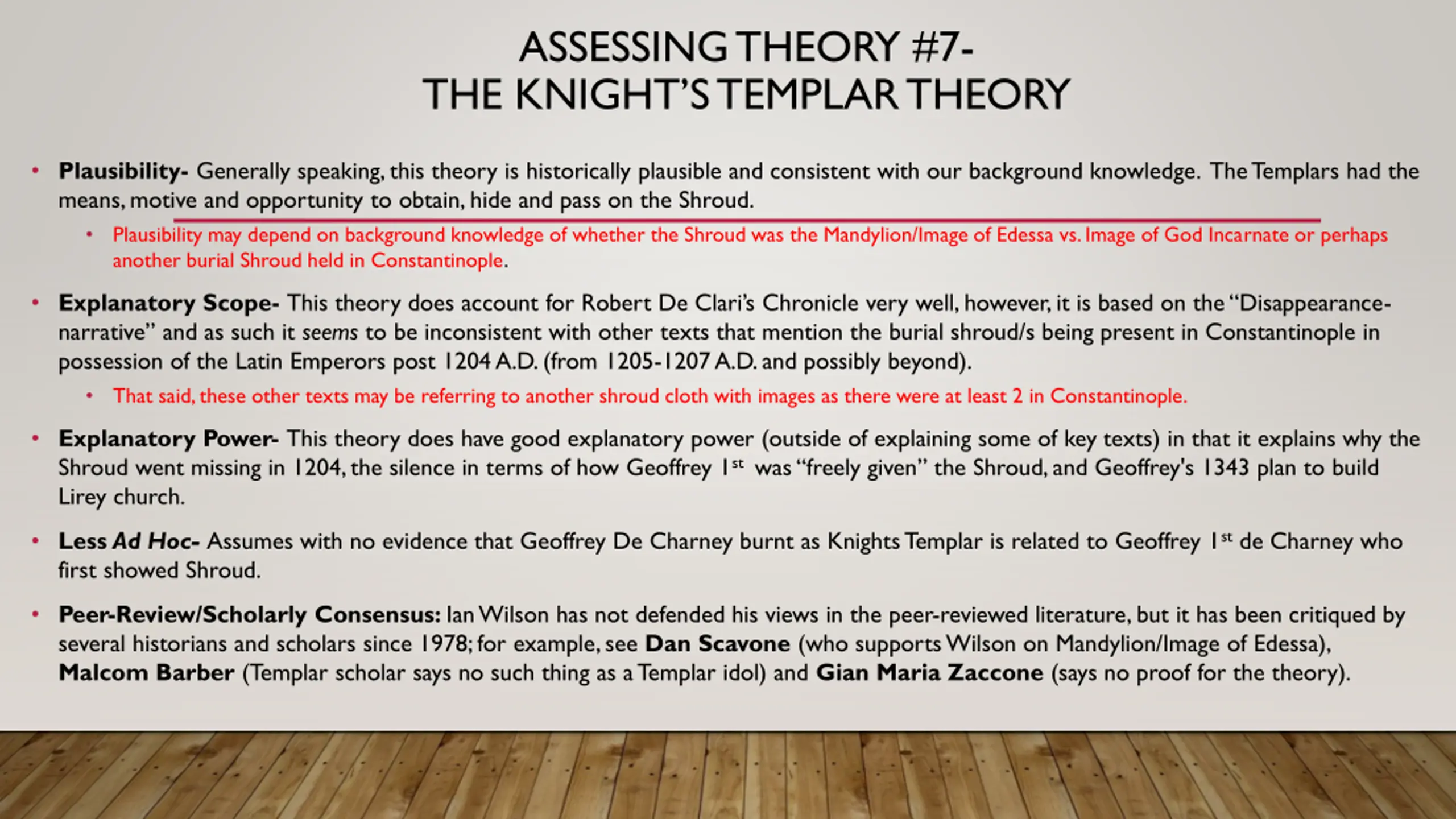 ASSESSING THEORY #7- THE KNIGHT S TEMPLAR THEORY Plausibility- Generally speaking, this theory is historically plausible and consistent with our background knowledge. The Templars had the means, motive and opportunity to obtain, hide and pass on the Shroud. Plausibility may depend on background knowledge of whether the Shroud was the Mandylion/Image of Edessa vs. Image of God Incarnate or perhaps another burial Shroud held in Constantinople. Explanatory Scope- This theory does account for Robert De Clari s Chronicle very well, however, it is based on the Disappearance- narrative and as such it seems to be inconsistent with other texts that mention the burial shroud/s being present in Constantinople in possession of the Latin Emperors post 1204 A.D. (from 1205-1207 A.D. and possibly beyond). That said, these other texts may be referring to another shroud cloth with images as there were at least 2 in Constantinople. Explanatory Power- This theory does have good explanatory power (outside of explaining some of key texts) in that it explains why the Shroud went missing in 1204, the silence in terms of how Geoffrey 1st was freely given the Shroud, and Geoffrey's 1343 plan to build Lirey church. Less Ad Hoc- Assumes with no evidence that Geoffrey De Charney burnt as Knights Templar is related to Geoffrey 1stde Charney who first showed Shroud. Peer-Review/Scholarly Consensus: Ian Wilson has not defended his views in the peer-reviewed literature, but it has been critiqued by several historians and scholars since 1978; for example, see Dan Scavone (who supports Wilson on Mandylion/Image of Edessa), Malcom Barber (Templar scholar says no such thing as a Templar idol) and Gian Maria Zaccone (says no proof for the theory).