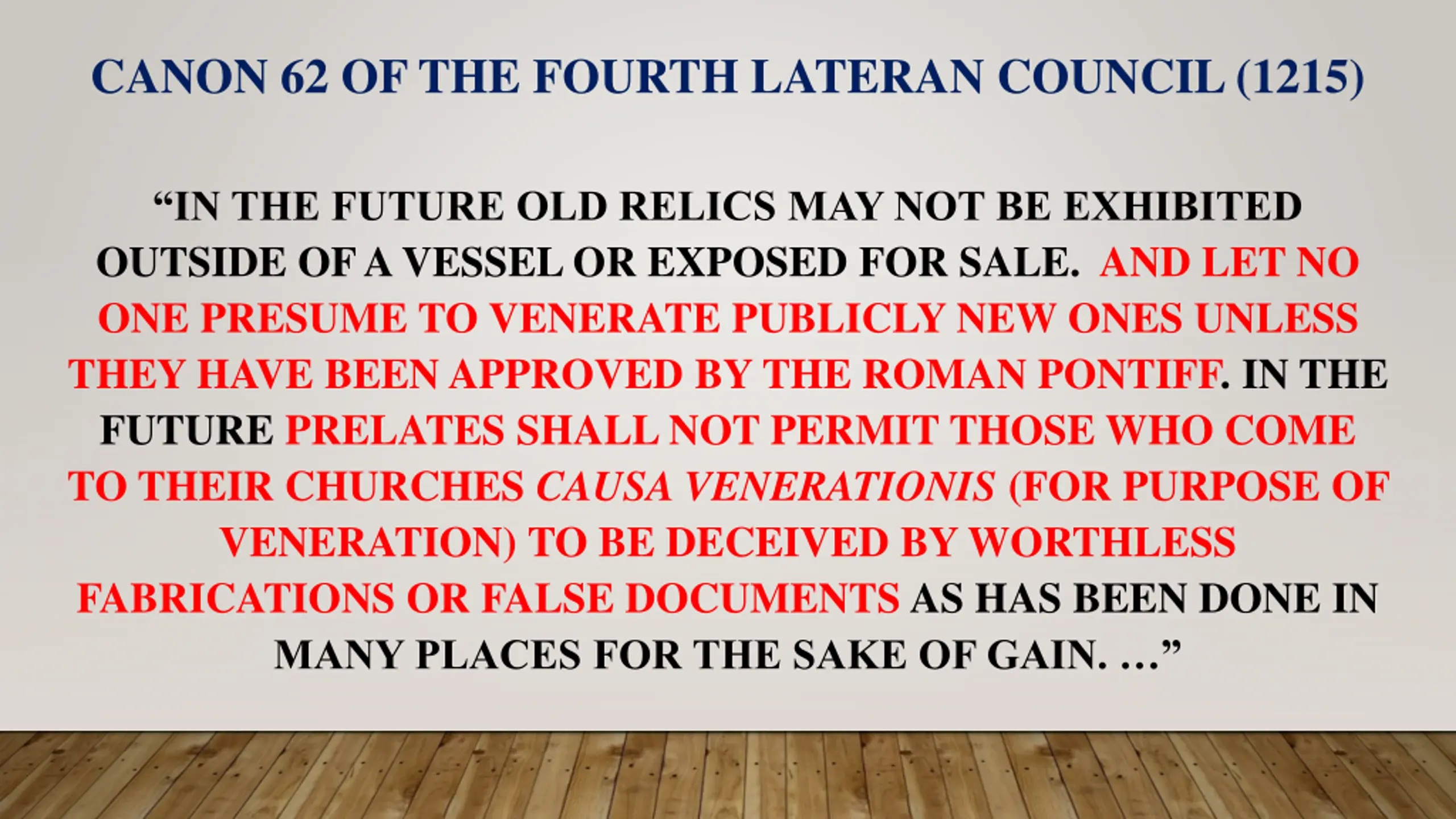 CANON 62 OF THE FOURTH LATERAN COUNCIL (1215) IN THE FUTURE OLD RELICS MAY NOT BE EXHIBITED OUTSIDE OF A VESSEL OR EXPOSED FOR SALE. AND LET NO ONE PRESUME TO VENERATE PUBLICLY NEW ONES UNLESS THEY HAVE BEEN APPROVED BY THE ROMAN PONTIFF. IN THE FUTURE PRELATES SHALL NOT PERMIT THOSE WHO COME TO THEIR CHURCHES CAUSA VENERATIONIS (FOR PURPOSE OF VENERATION) TO BE DECEIVED BY WORTHLESS FABRICATIONS OR FALSE DOCUMENTS AS HAS BEEN DONE IN MANY PLACES FOR THE SAKE OF GAIN.