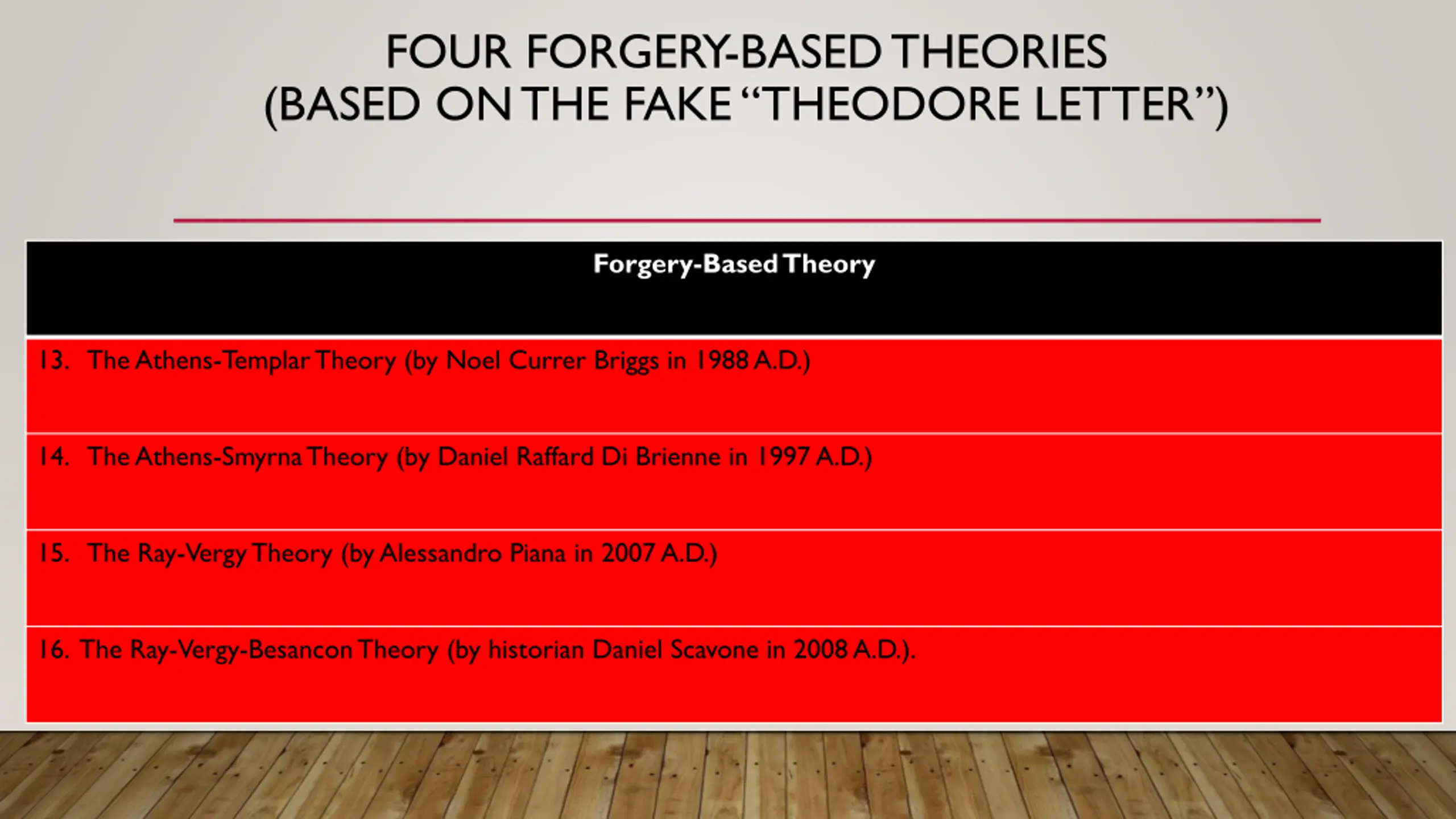FOUR FORGERY-BASED THEORIES (BASED ON THE FAKE THEODORE LETTER ) Forgery-Based Theory 13. The Athens-Templar Theory (by Noel Currer Briggs in 1988 A.D.) 14. The Athens-Smyrna Theory (by Daniel Raffard Di Brienne in 1997 A.D.) 15. The Ray-VergyTheory (by Alessandro Piana in 2007 A.D.) 16. The Ray-Vergy-Besancon Theory (by historian Daniel Scavone in 2008 A.D.).