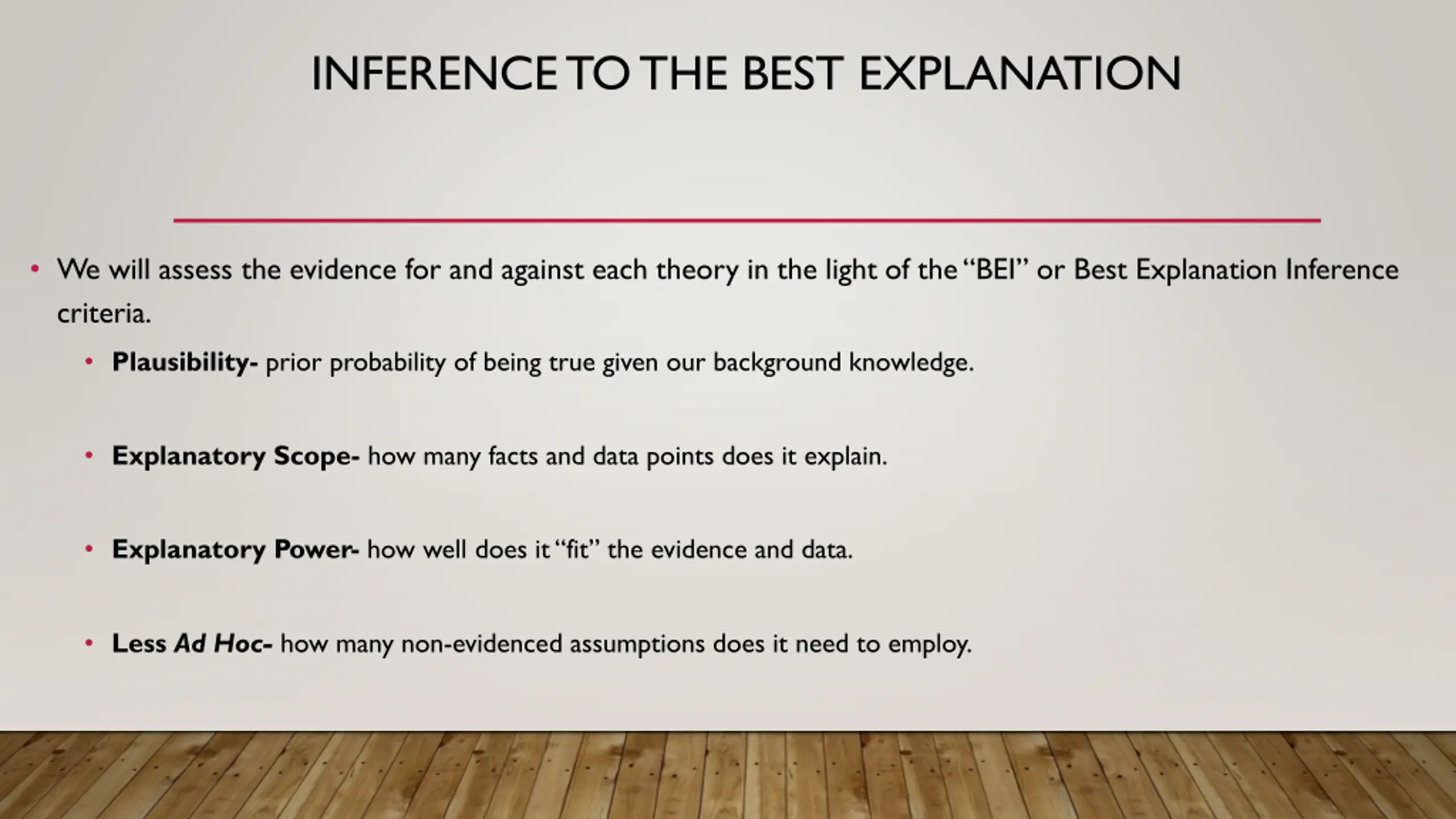 INFERENCE TO THE BEST EXPLANATION We will assess the evidence for and against each theory in the light of the BEI or Best Explanation Inference criteria. Plausibility- prior probability of being true given our background knowledge. Explanatory Scope- how many facts and data points does it explain. Explanatory Power- how well does it fit the evidence and data. Less Ad Hoc- how many non-evidenced assumptions does it need to employ.