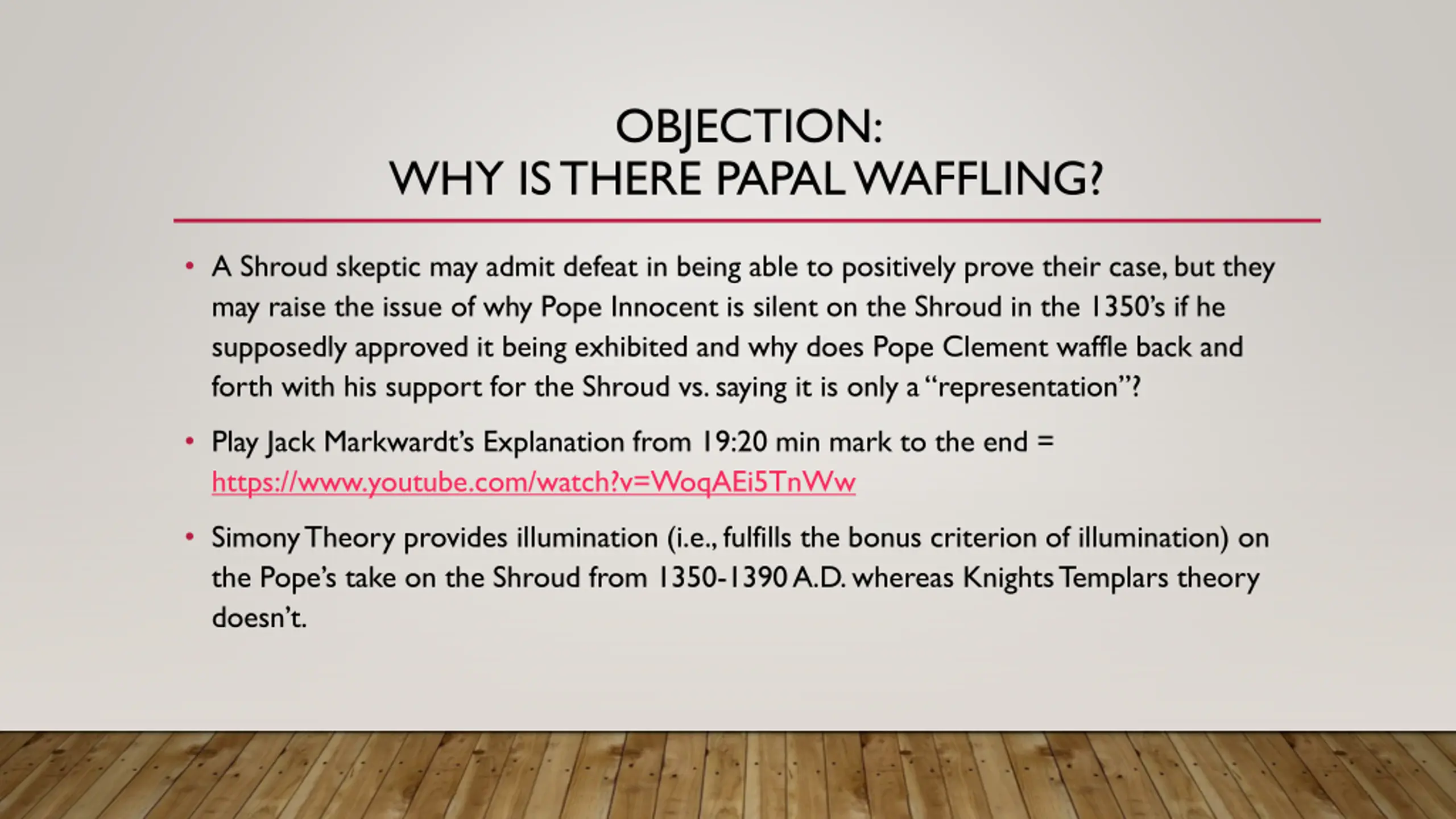 OBJECTION: WHY IS THERE PAPAL WAFFLING? A Shroud skeptic may admit defeat in being able to positively prove their case, but they may raise the issue of why Pope Innocent is silent on the Shroud in the 1350 s if he supposedly approved it being exhibited and why does Pope Clement waffle back and forth with his support for the Shroud vs. saying it is only a representation ? Play Jack Markwardt s Explanation from 19:20 min mark to the end = https://www.youtube.com/watch?v=WoqAEi5TnWw Simony Theory provides illumination (i.e., fulfills the bonus criterion of illumination) on the Pope s take on the Shroud from 1350-1390 A.D. whereas Knights Templars theory doesn t.