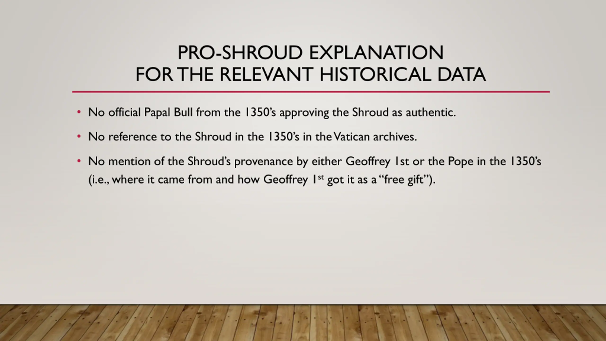PRO-SHROUD EXPLANATION FOR THE RELEVANT HISTORICAL DATA No official Papal Bull from the 1350 s approving the Shroud as authentic. No reference to the Shroud in the 1350 s in the Vatican archives. No mention of the Shroud s provenance by either Geoffrey 1st or the Pope in the 1350 s (i.e., where it came from and how Geoffrey 1stgot it as a free gift ).