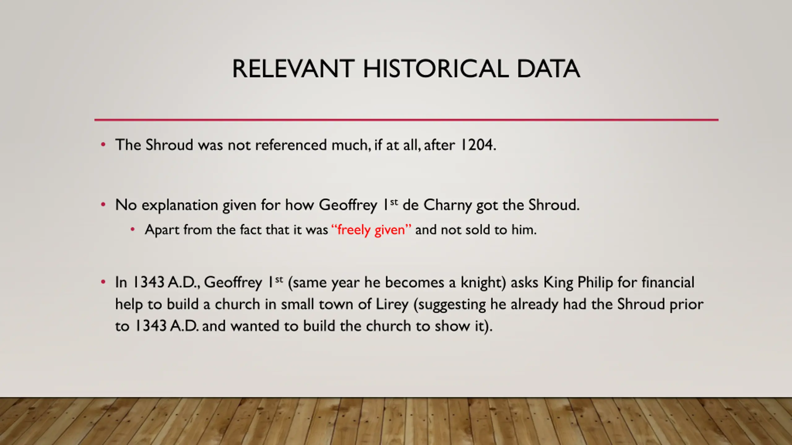 RELEVANT HISTORICAL DATA The Shroud was not referenced much, if at all, after 1204. No explanation given for how Geoffrey 1stde Charny got the Shroud. Apart from the fact that it was freely given and not sold to him. In 1343 A.D., Geoffrey 1st(same year he becomes a knight) asks King Philip for financial help to build a church in small town of Lirey (suggesting he already had the Shroud prior to 1343 A.D. and wanted to build the church to show it).