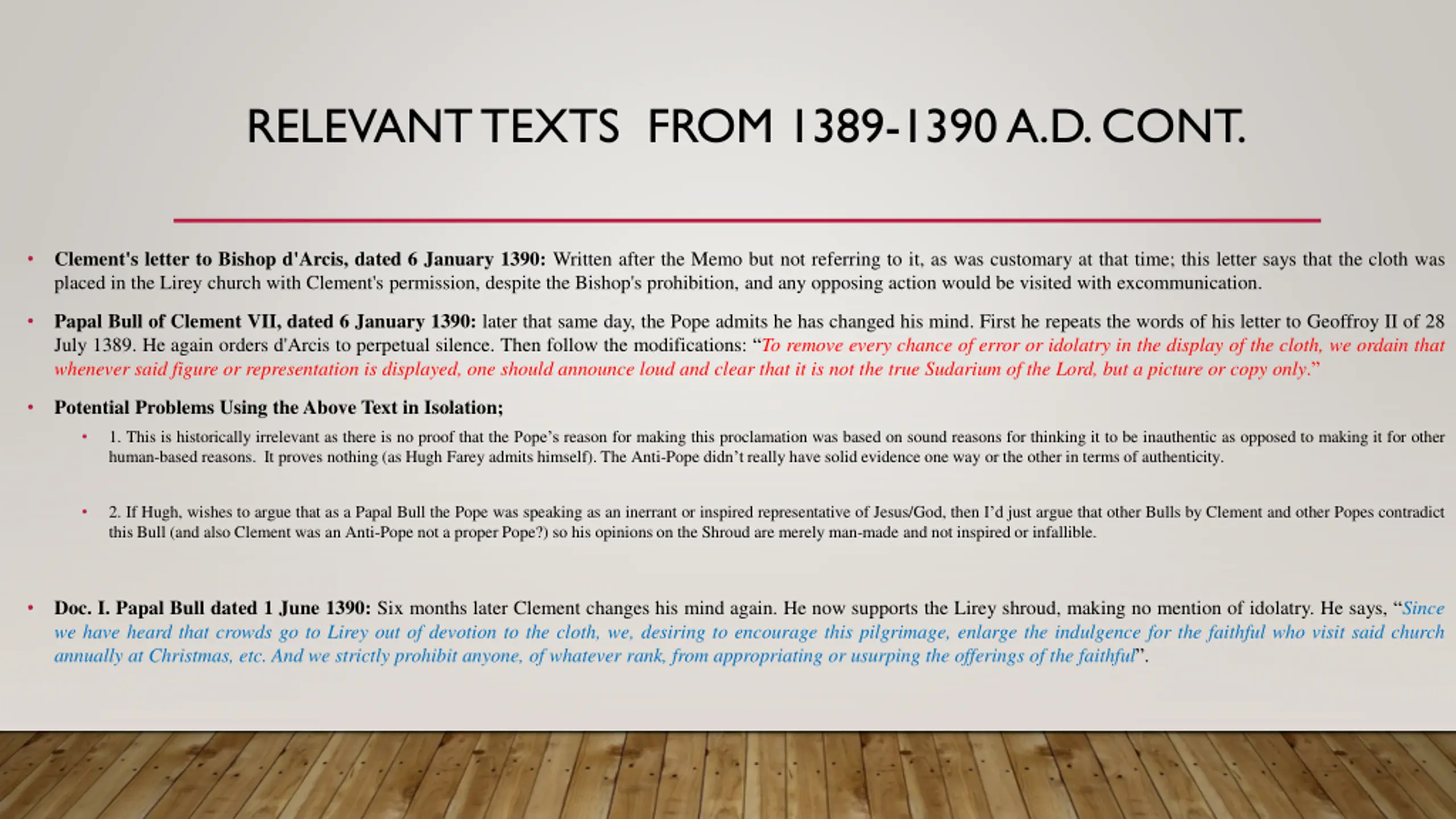 RELEVANT TEXTS FROM 1389-1390 A.D. CONT. Clement's letter to Bishop d'Arcis, dated 6 January 1390: Written after the Memo but not referring to it, as was customary at that time; this letter says that the cloth was placed in the Lirey church with Clement's permission, despite the Bishop's prohibition, and any opposing action would be visited with excommunication. Papal Bull of Clement VII, dated 6 January 1390: later that same day, the Pope admits he has changed his mind. First he repeats the words of his letter to Geoffroy II of 28 July 1389. He again orders d'Arcis to perpetual silence. Then follow the modifications: To remove every chance of error or idolatry in the display of the cloth, we ordain that whenever said figure or representation is displayed, one should announce loud and clear that it is not the true Sudarium of the Lord, but a picture or copy only. Potential Problems Using the Above Text in Isolation; 1. This is historically irrelevant as there is no proof that the Pope s reason for making this proclamation was based on sound reasons for thinking it to be inauthentic as opposed to making it for other human-based reasons. It proves nothing (as Hugh Farey admits himself). The Anti-Pope didn t really have solid evidence one way or the other in terms of authenticity. 2. If Hugh, wishes to argue that as a Papal Bull the Pope was speaking as an inerrant or inspired representative of Jesus/God, then I d just argue that other Bulls by Clement and other Popes contradict this Bull (and also Clement was an Anti-Pope not a proper Pope?) so his opinions on the Shroud are merely man-made and not inspired or infallible. Doc. I. Papal Bull dated 1 June 1390: Six months later Clement changes his mind again. He now supports the Lirey shroud, making no mention of idolatry. He says, Since we have heard that crowds go to Lirey out of devotion to the cloth, we, desiring to encourage this pilgrimage, enlarge the indulgence for the faithful who visit said church annually at Christmas, etc. And we strictly prohibit anyone, of whatever rank, from appropriating or usurping the offerings of the faithful .