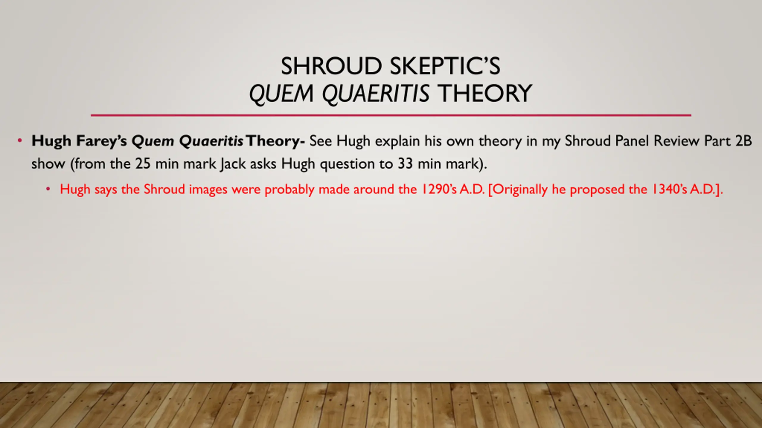 SHROUD SKEPTICS QUEM QUAERITIS THEORY Hugh Farey s Quem QuaeritisTheory- See Hugh explain his own theory in my Shroud Panel Review Part 2B show (from the 25 min mark Jack asks Hugh question to 33 min mark). Hugh says the Shroud images were probably made around the 1290 s A.D. [Originally he proposed the 1340 s A.D.].